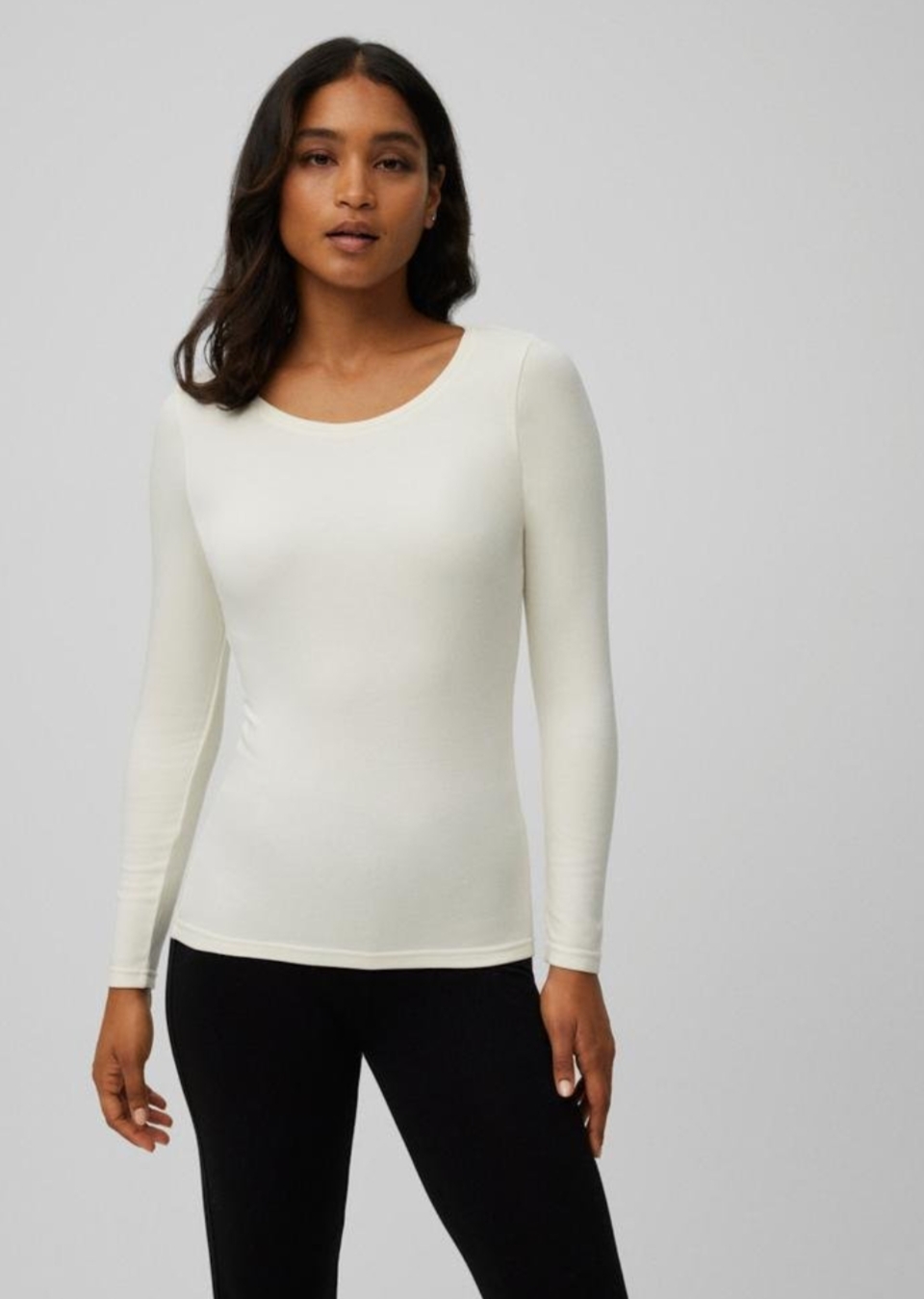 • Mulher com camisola branca de manga comprida e gola arredondada