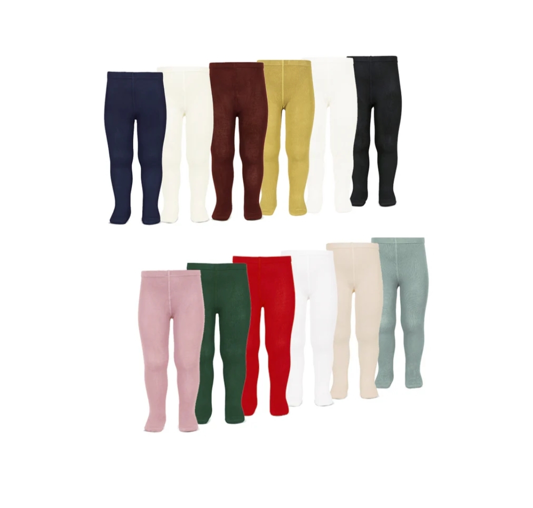 • Leggings coloridas para crianças em várias cores sólidas organizadas em duas filas sobre fundo branco