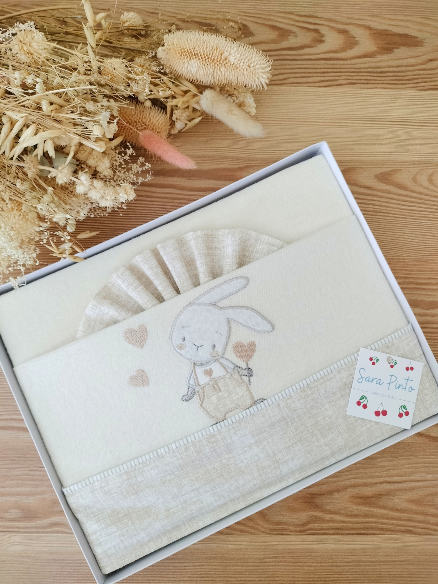 • Conjunto de roupa de bebé bege com coelho bordado, embalagem branca e flores secas ao lado