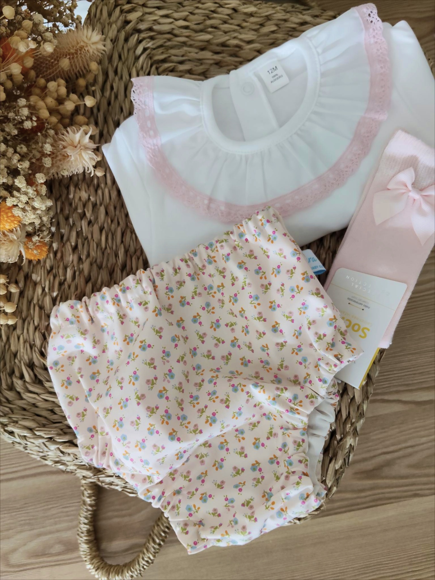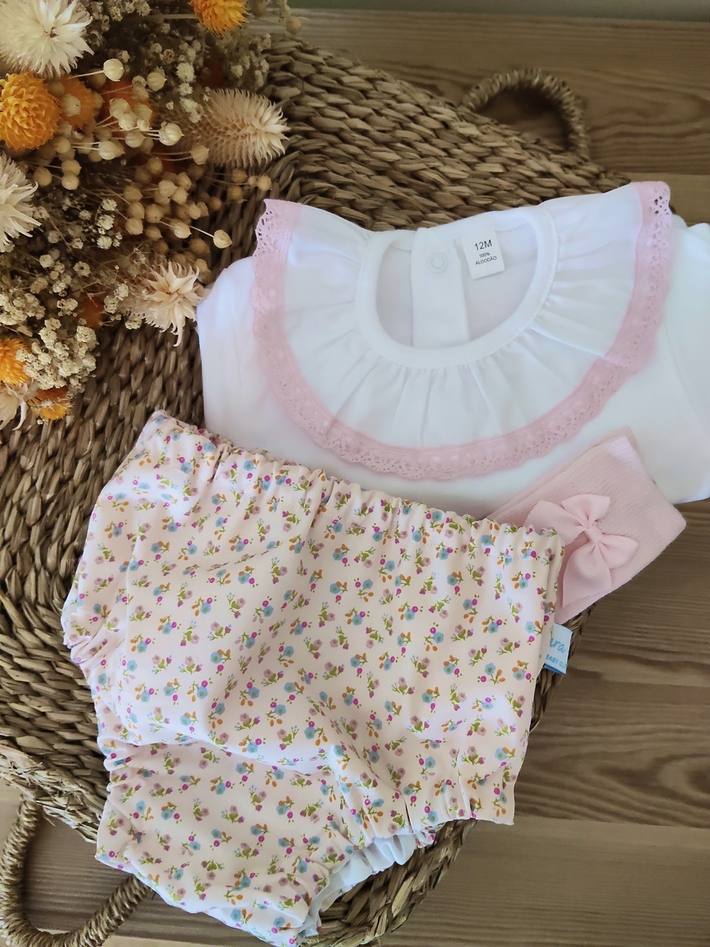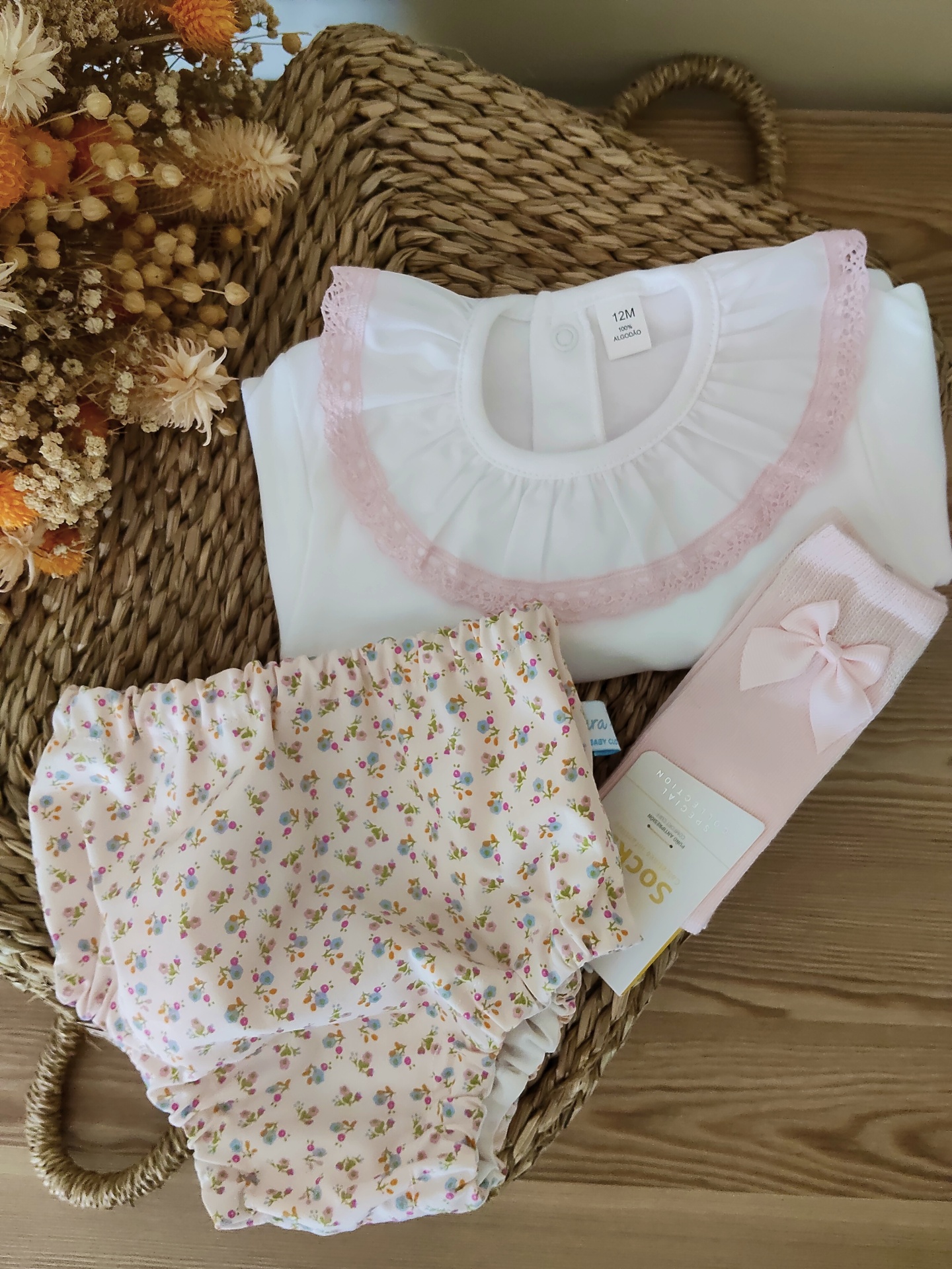 Conjunto de 3 peças body de manga comprida, tapa fraldas e meias pelo joelho com laço.