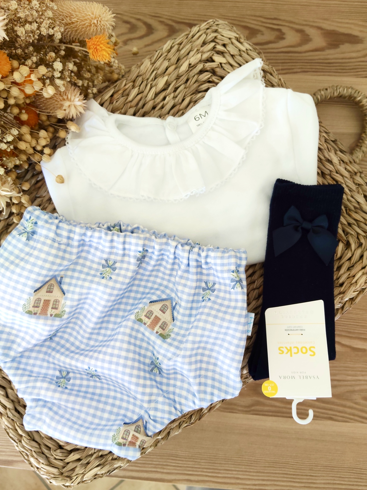 Conjunto de roupa de bebé com camisola branca, calções azul claro com padrão de casas e flores, meias pretas com laço.