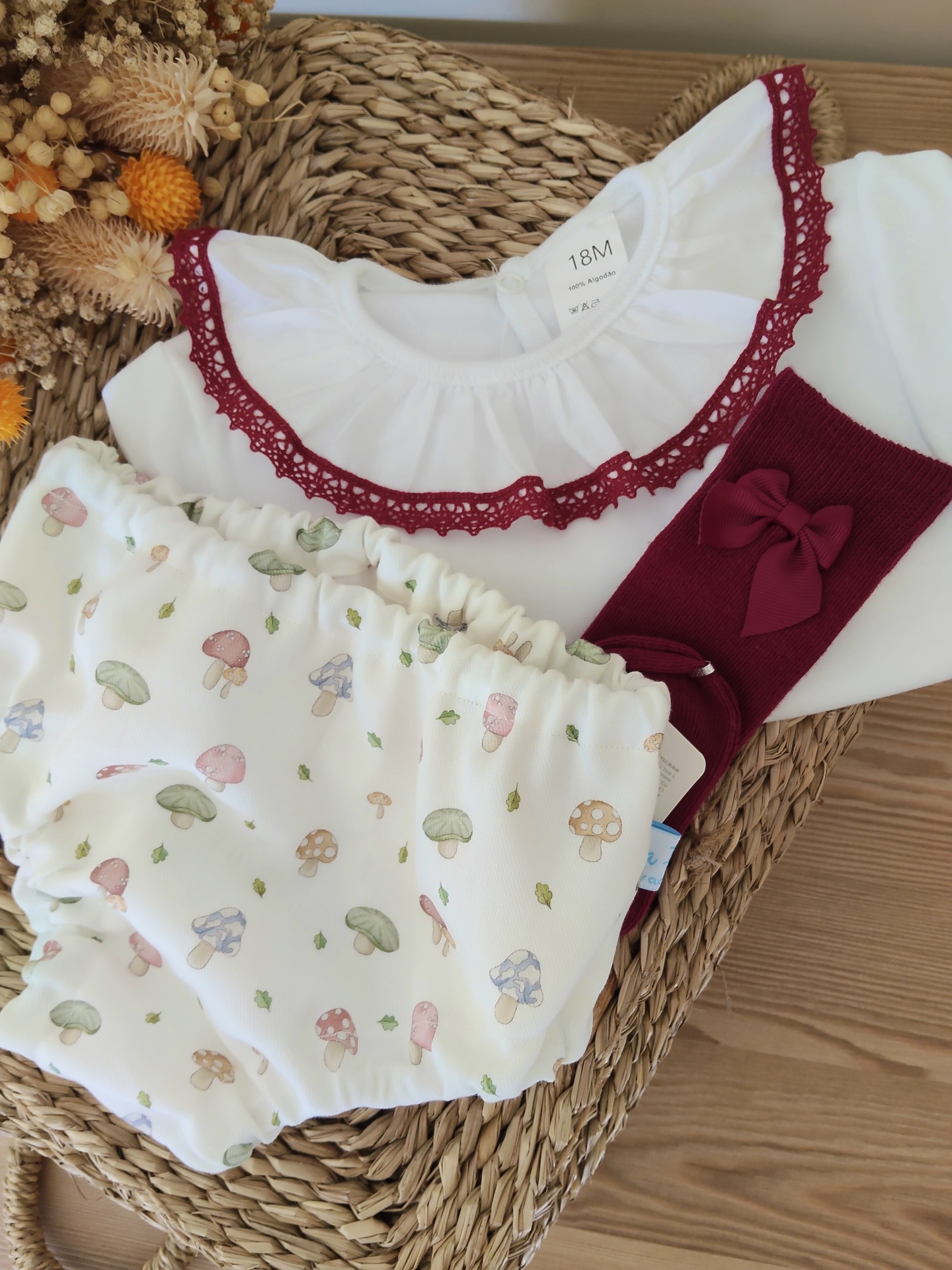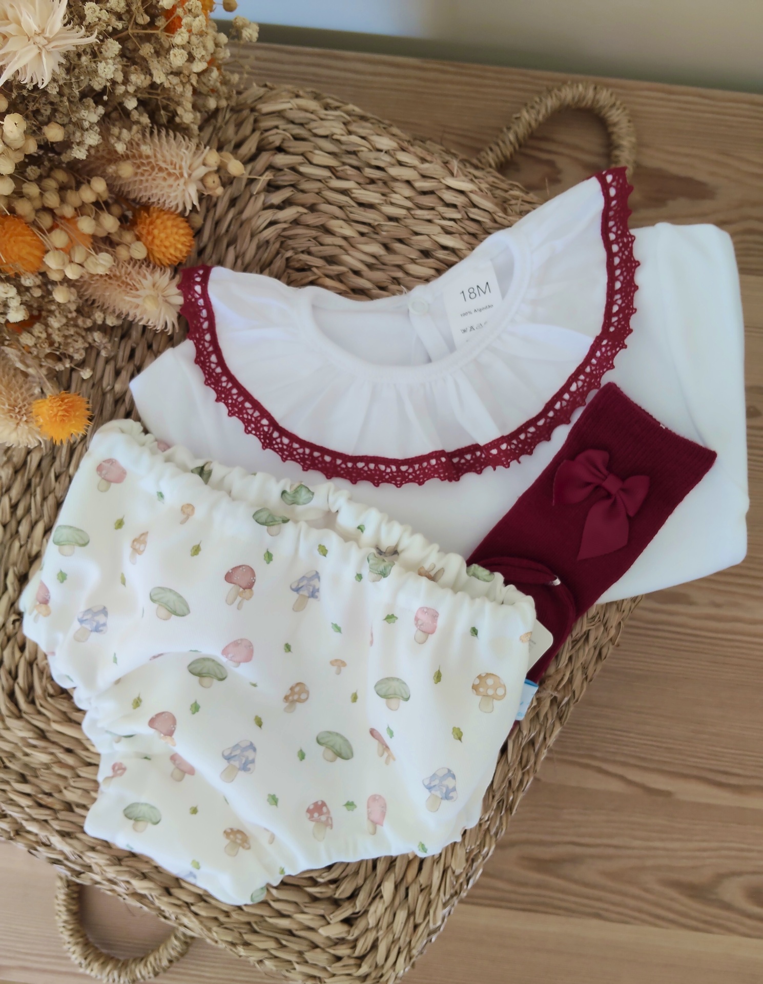 Conjunto de 3 peças composto por tapa fraldas, body de manga comprida e meia pelo joelho com laço.