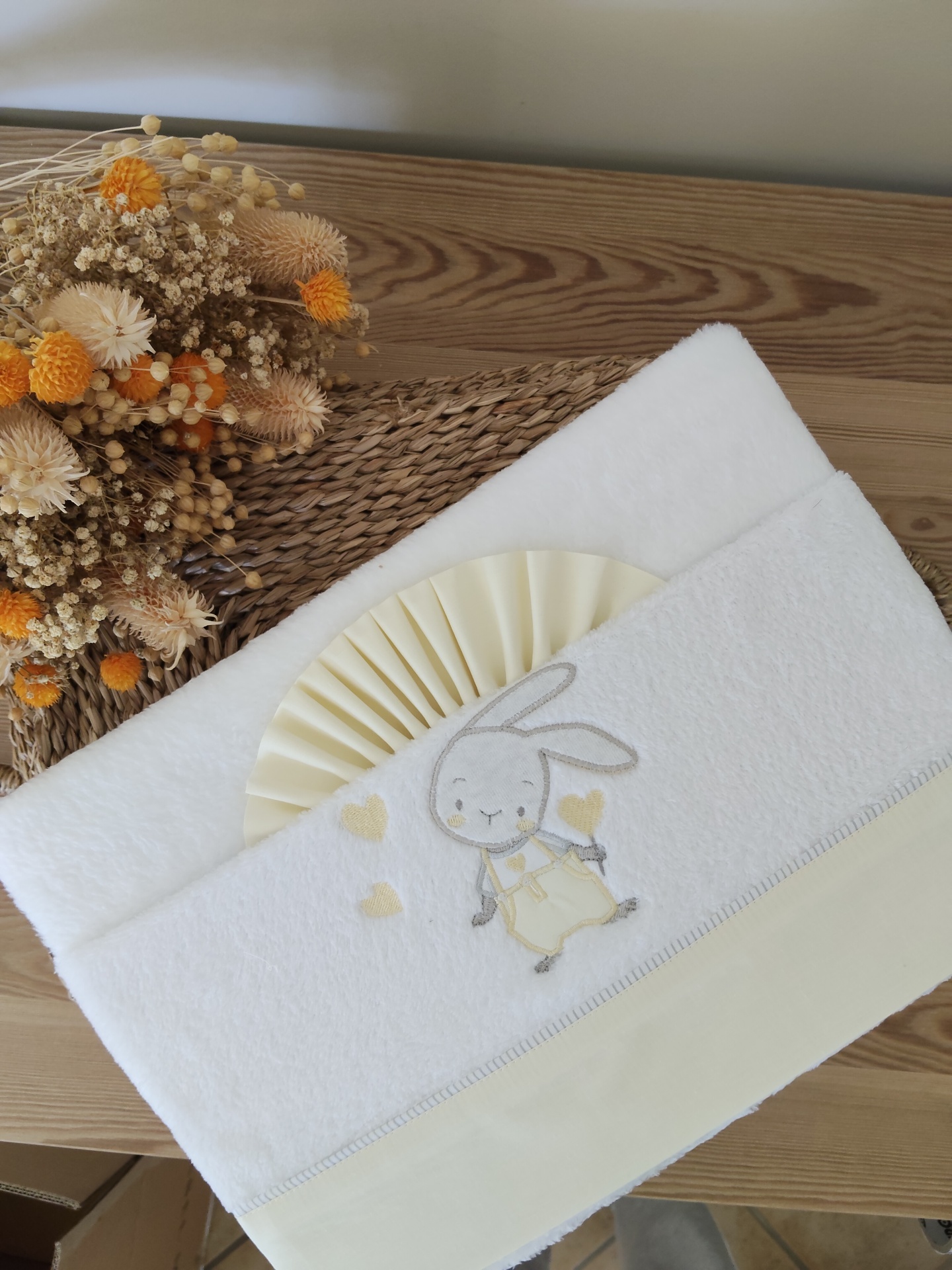 • Toalha branca com bordado de coelho e corações em cinza e amarelo sobre mesa de madeira com flores secas.