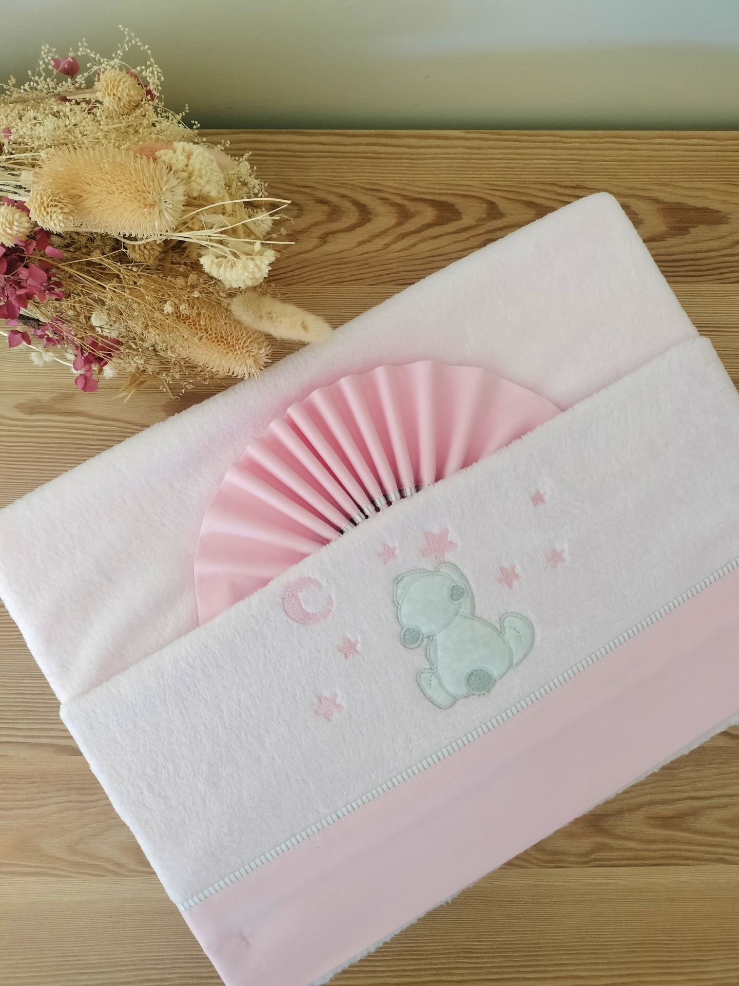 • Fralda de bebé cor-de-rosa com ursinho azul bordado