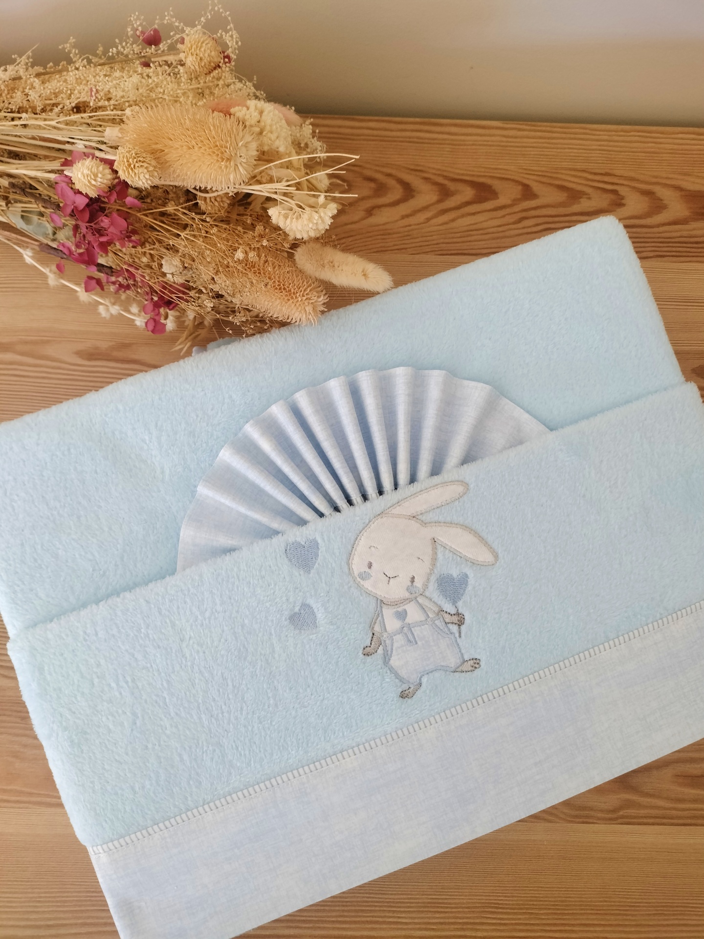 Toalha azul clara com bordado de coelho e leque branco numa superfície de madeira com flores secas ao lado