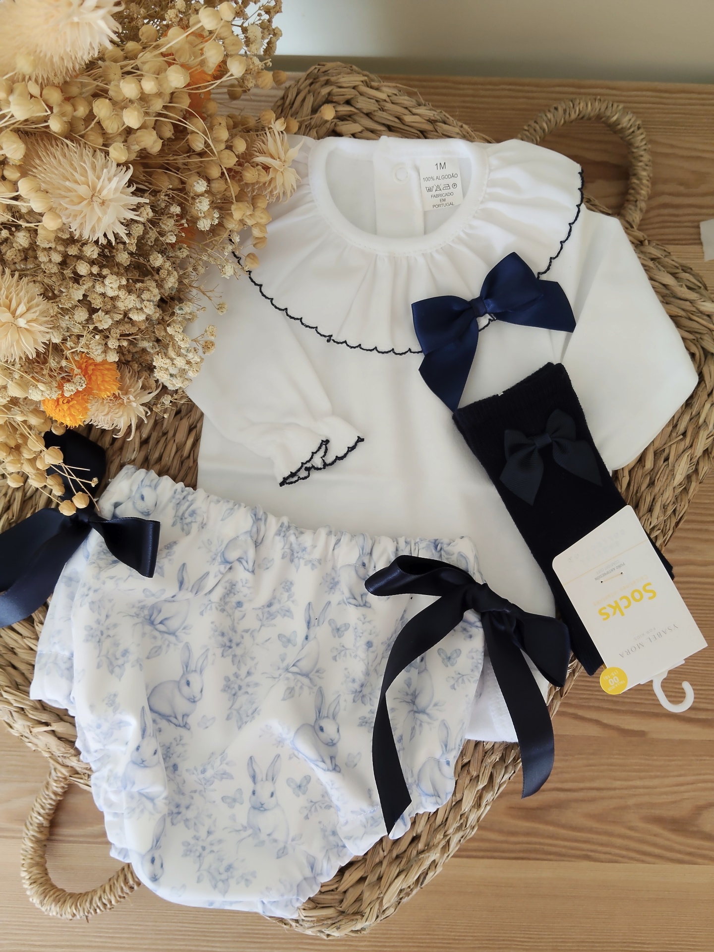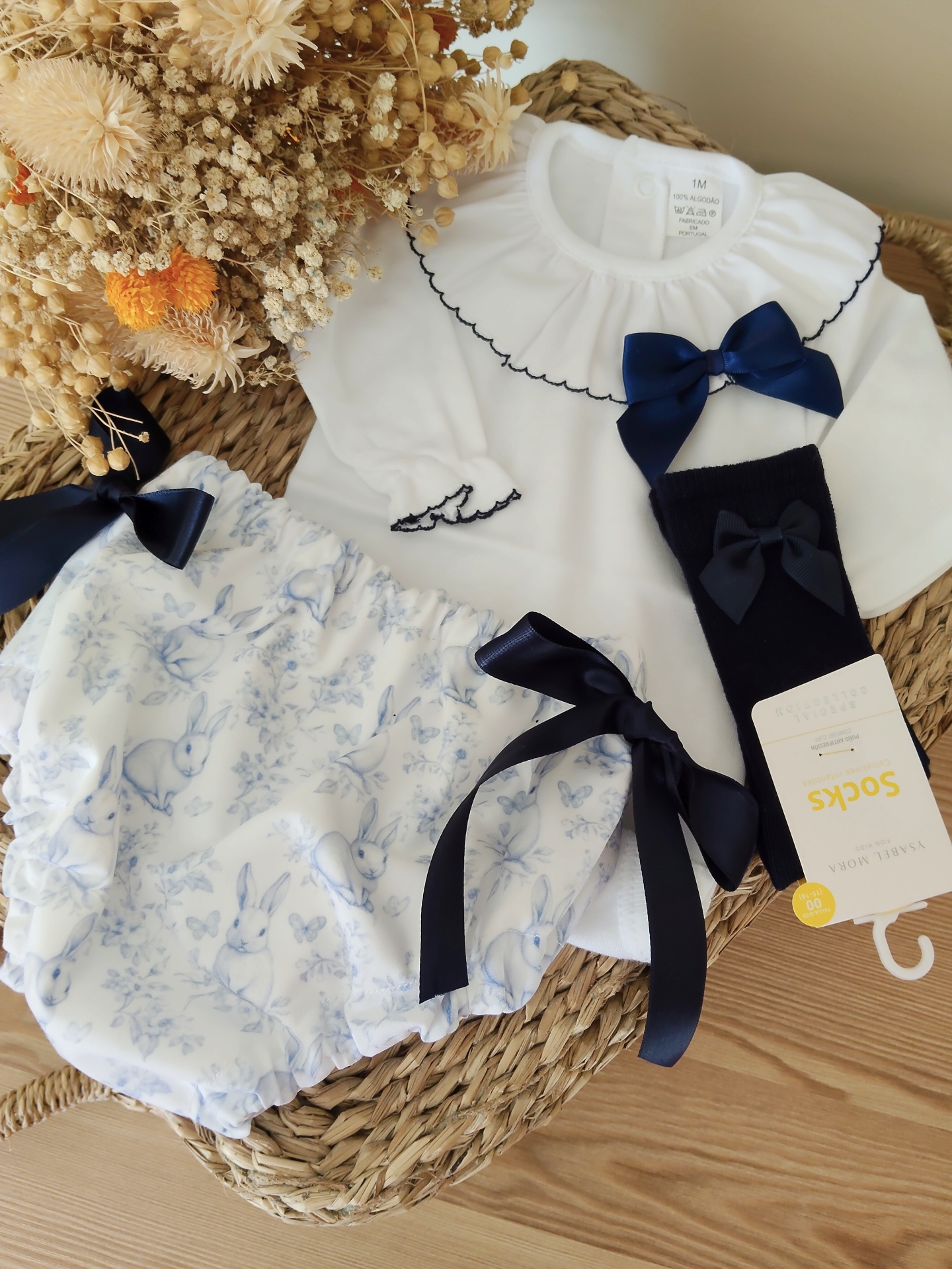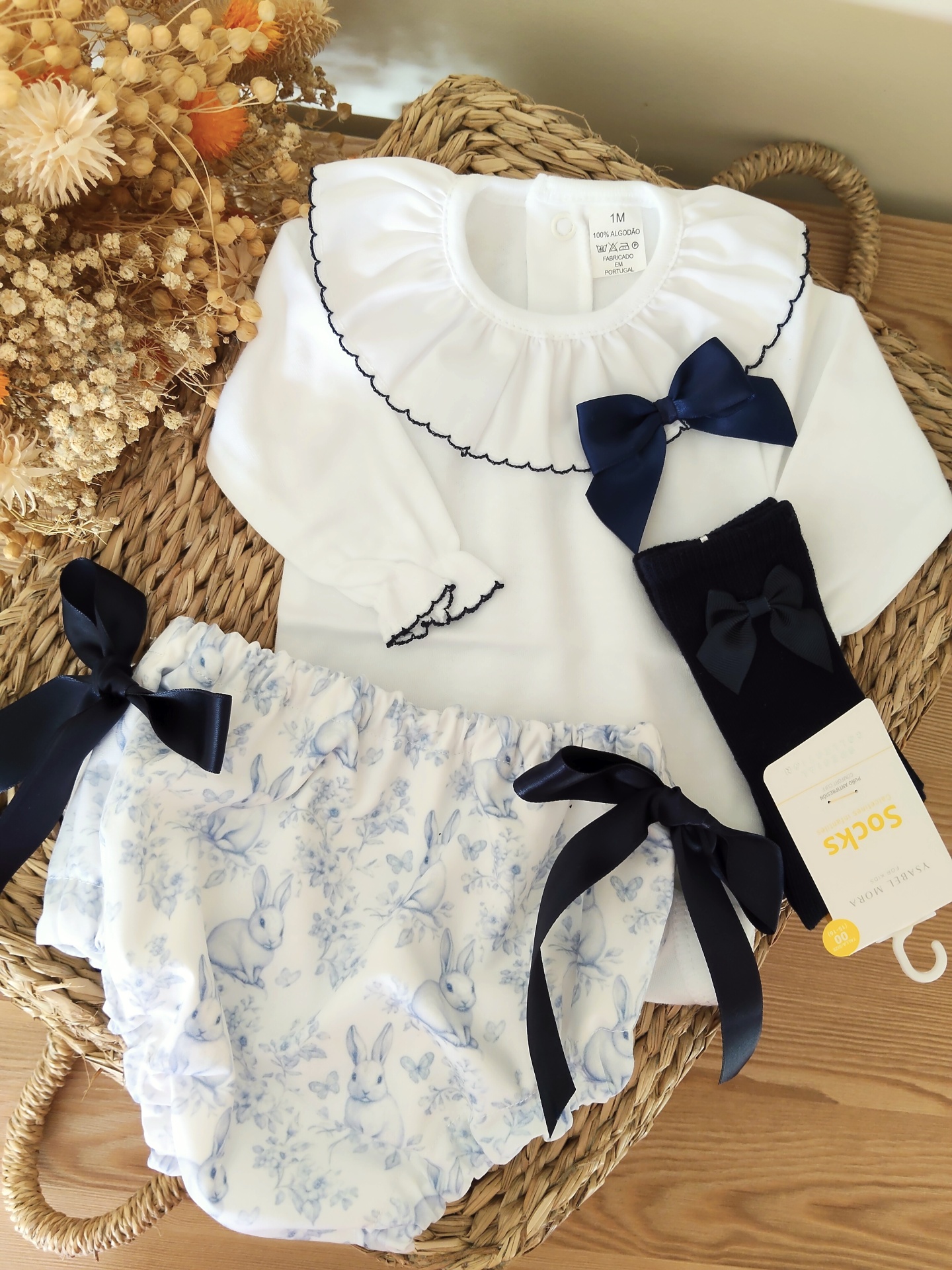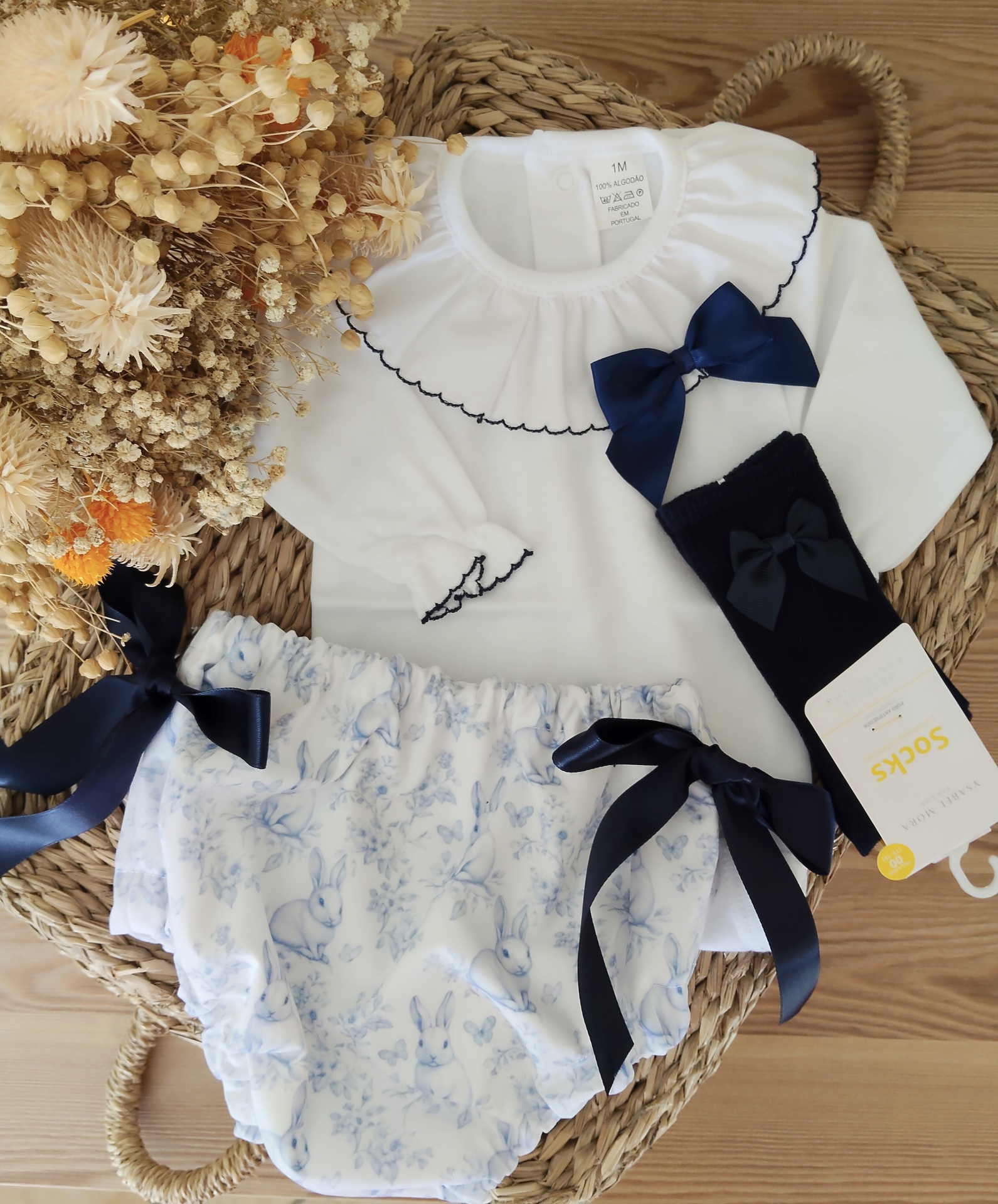 • Conjunto de roupa para bebé com body branco, bombazine com coelhinhos e meias azuis com laço.