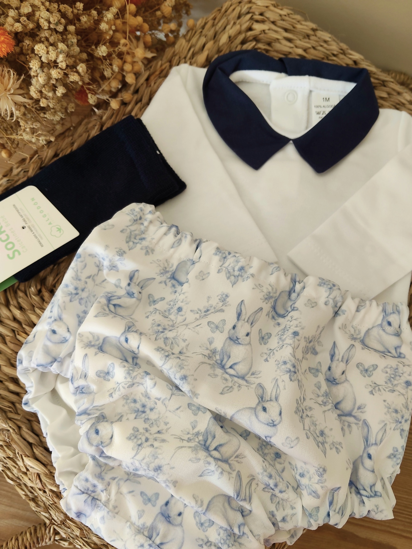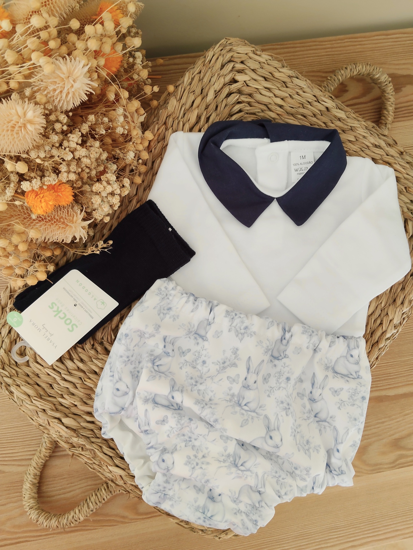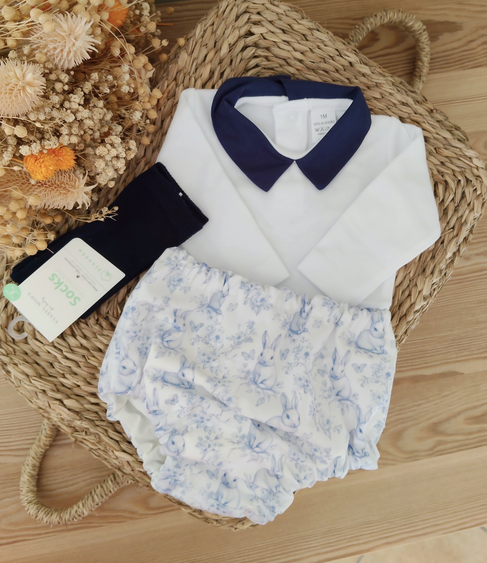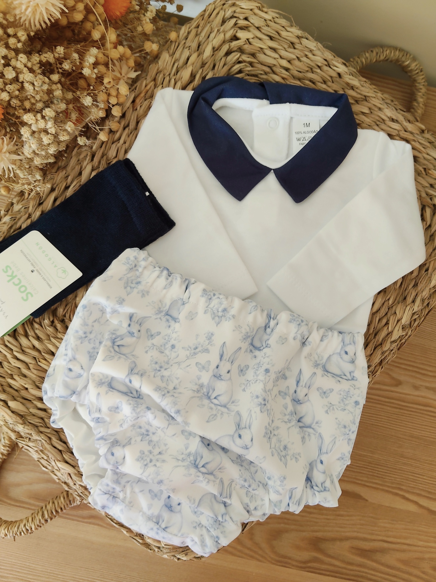 • Conjunto de roupa de bebé com camisa branca, colarinho azul, cueiro com padrão de coelhos e flores azuis e meias pretas em cesta de verga