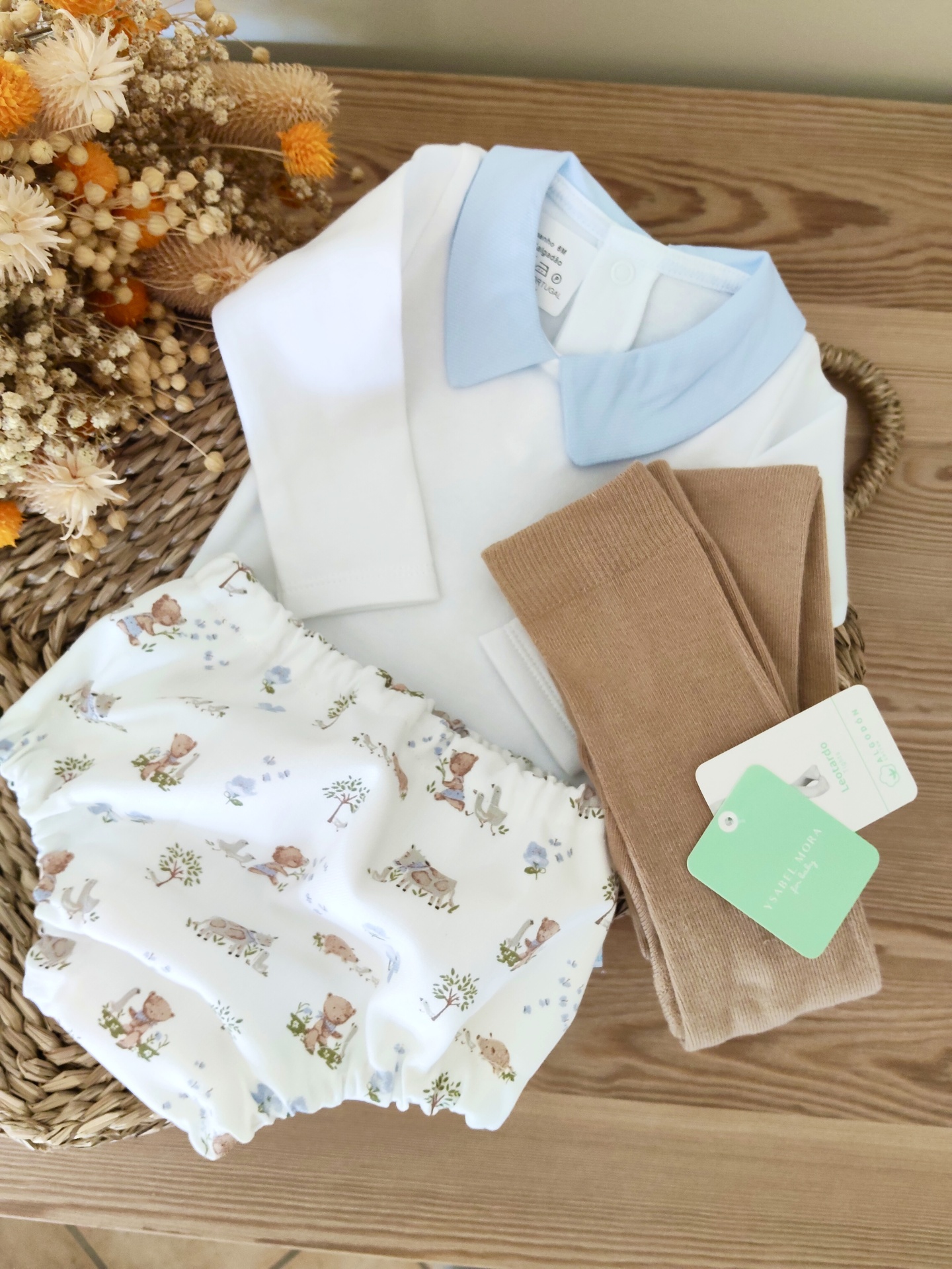 Conjunto de 3 peças composto por tapa fraldas, collants e body.