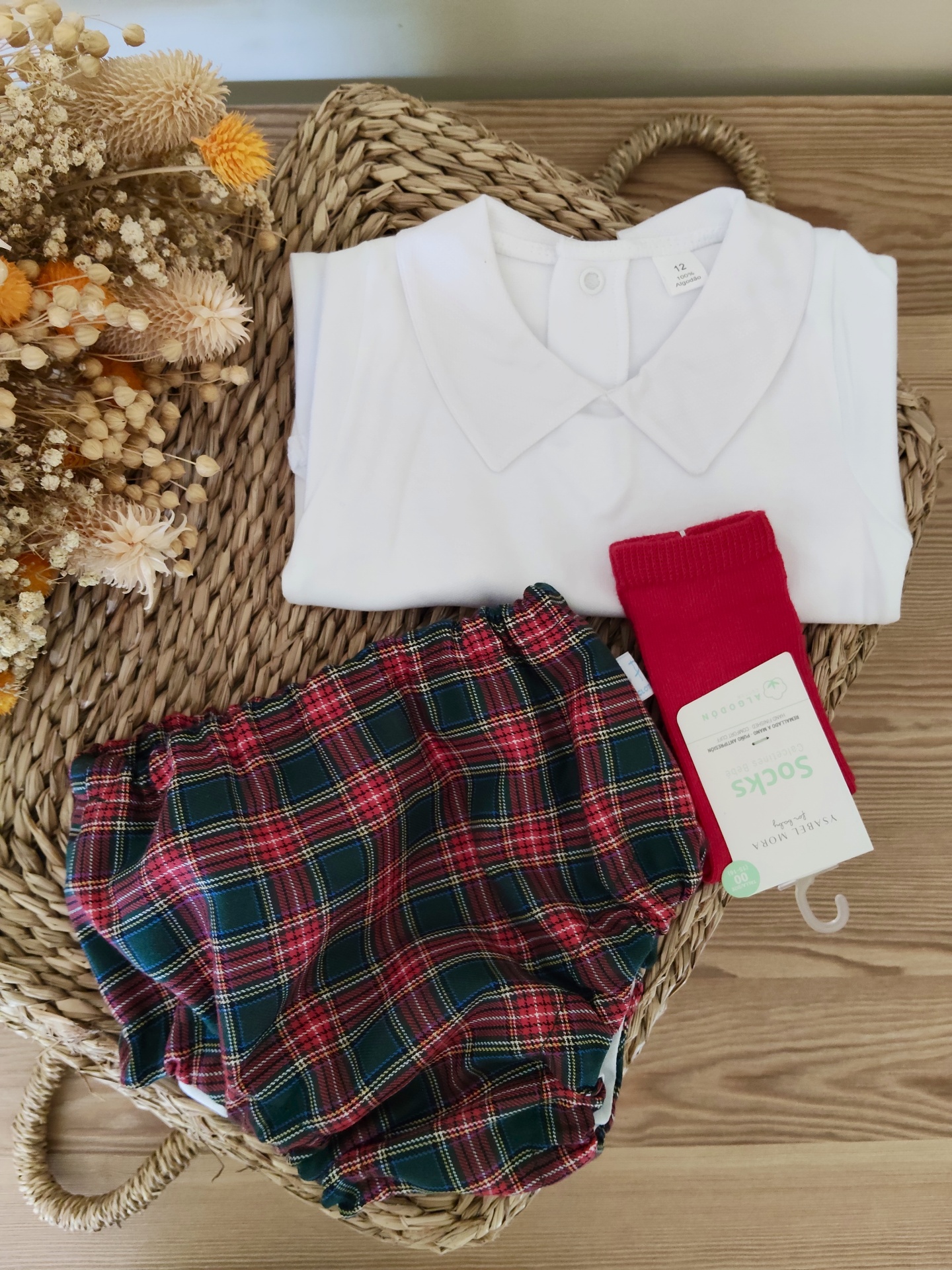 Conjunto composto por tapa fraldas, body e meia pelo joelho.