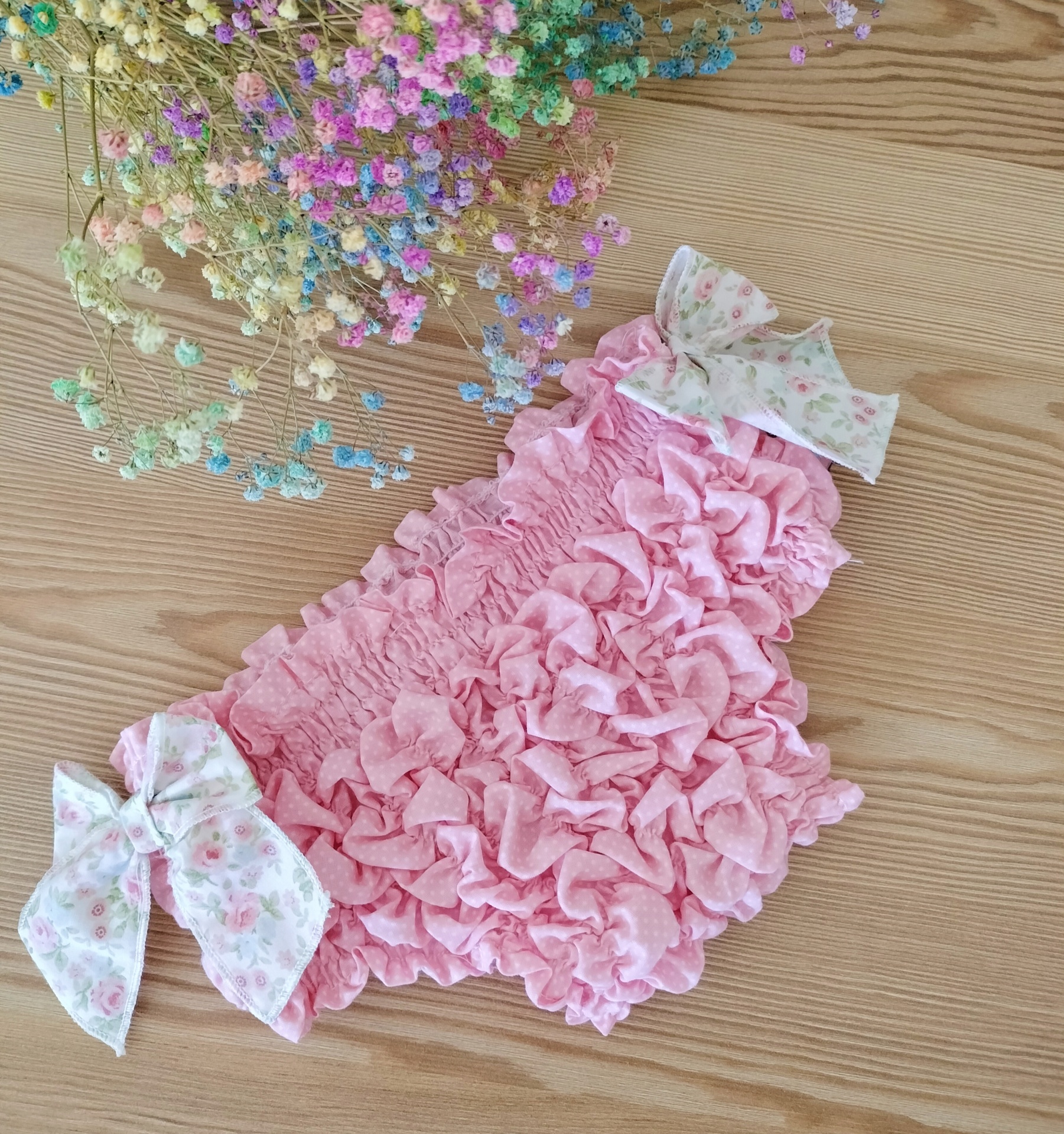 • Cueca de bebé rosa com laços florais e flores coloridas ao lado