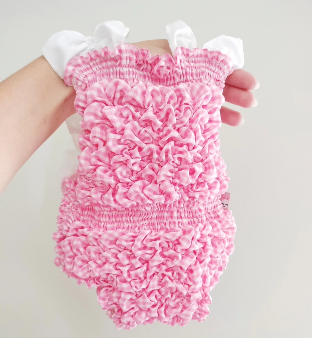 • Pano de banho rosa xadrez com textura franzida e alças brancas