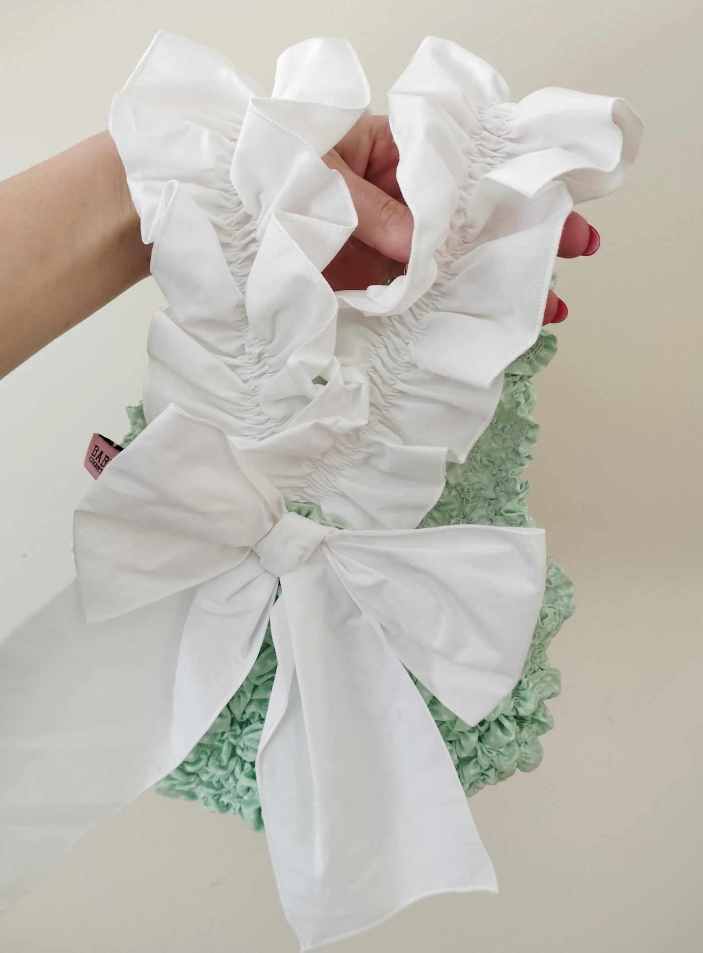 • Mala de mão verde com alças e laço brancos babados