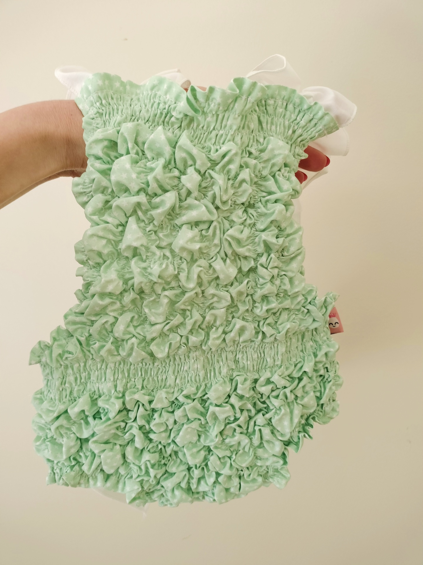 • Macacão de bebé verde claro franzido com alças brancas