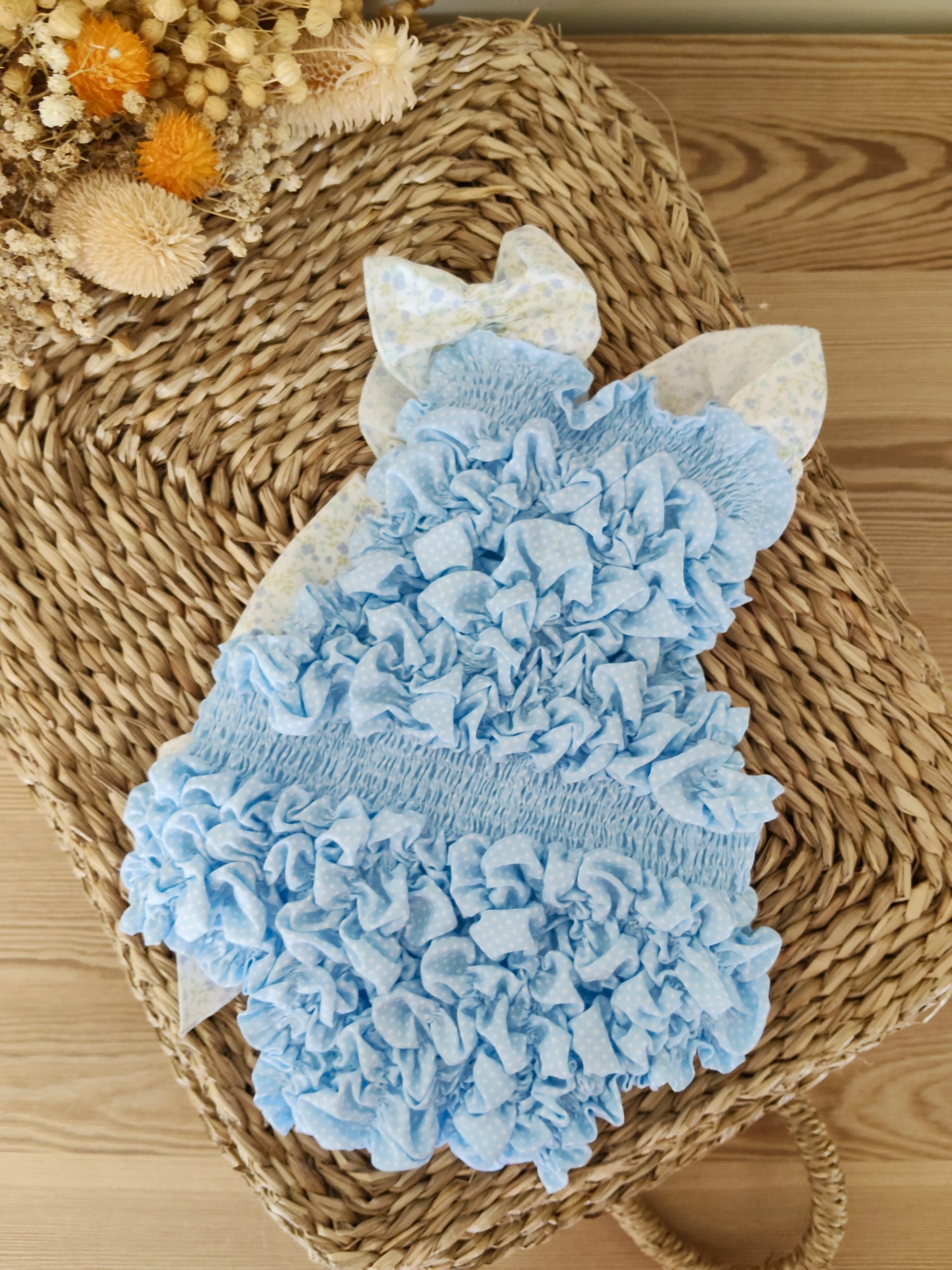 • Roupa de bebé azul claro com folhos e padrões de bolinhas e flores sobre mala de palha e flores secas