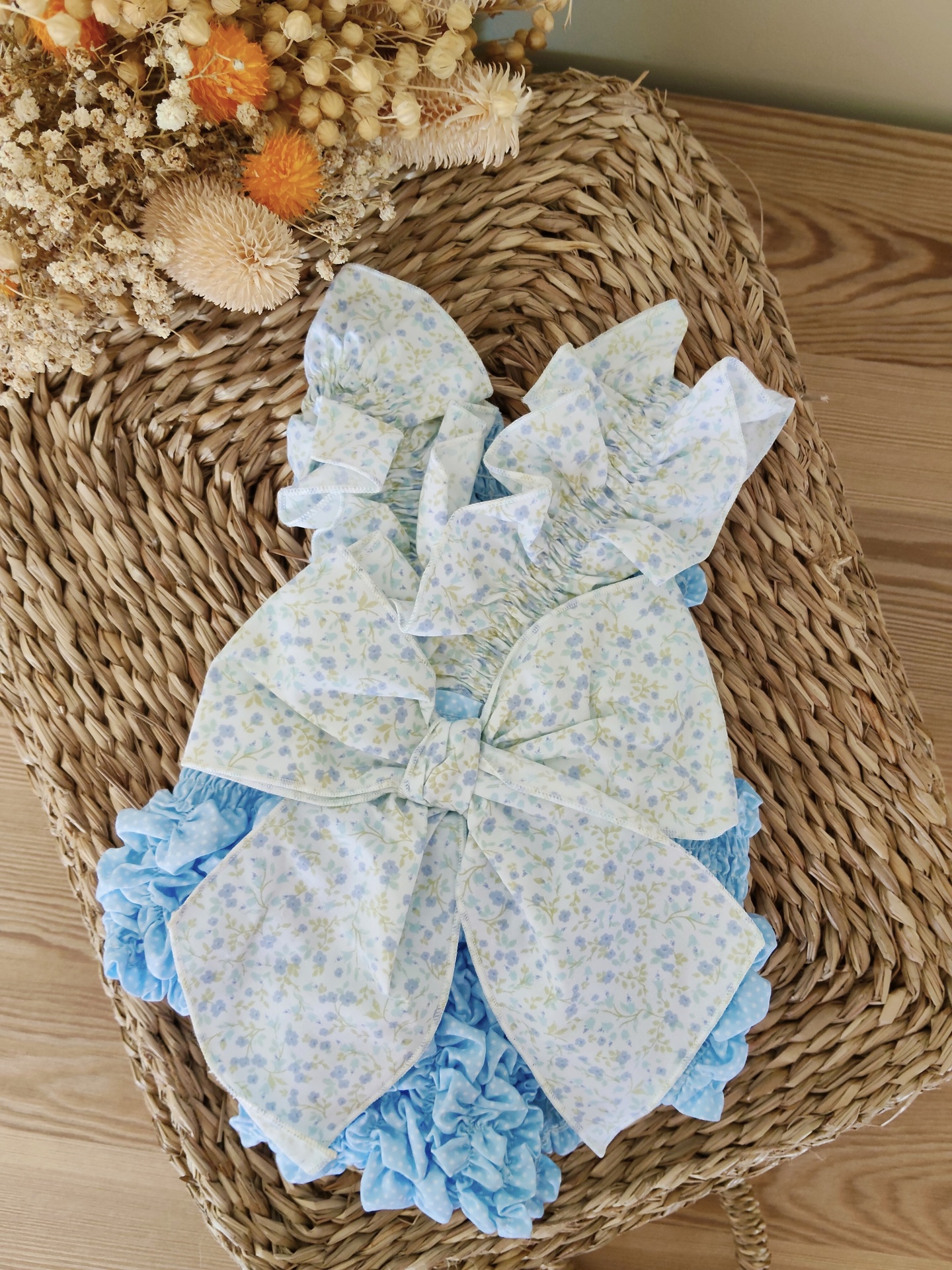• Vestido azul claro floral com laço grande sobre tapete de palha trançada