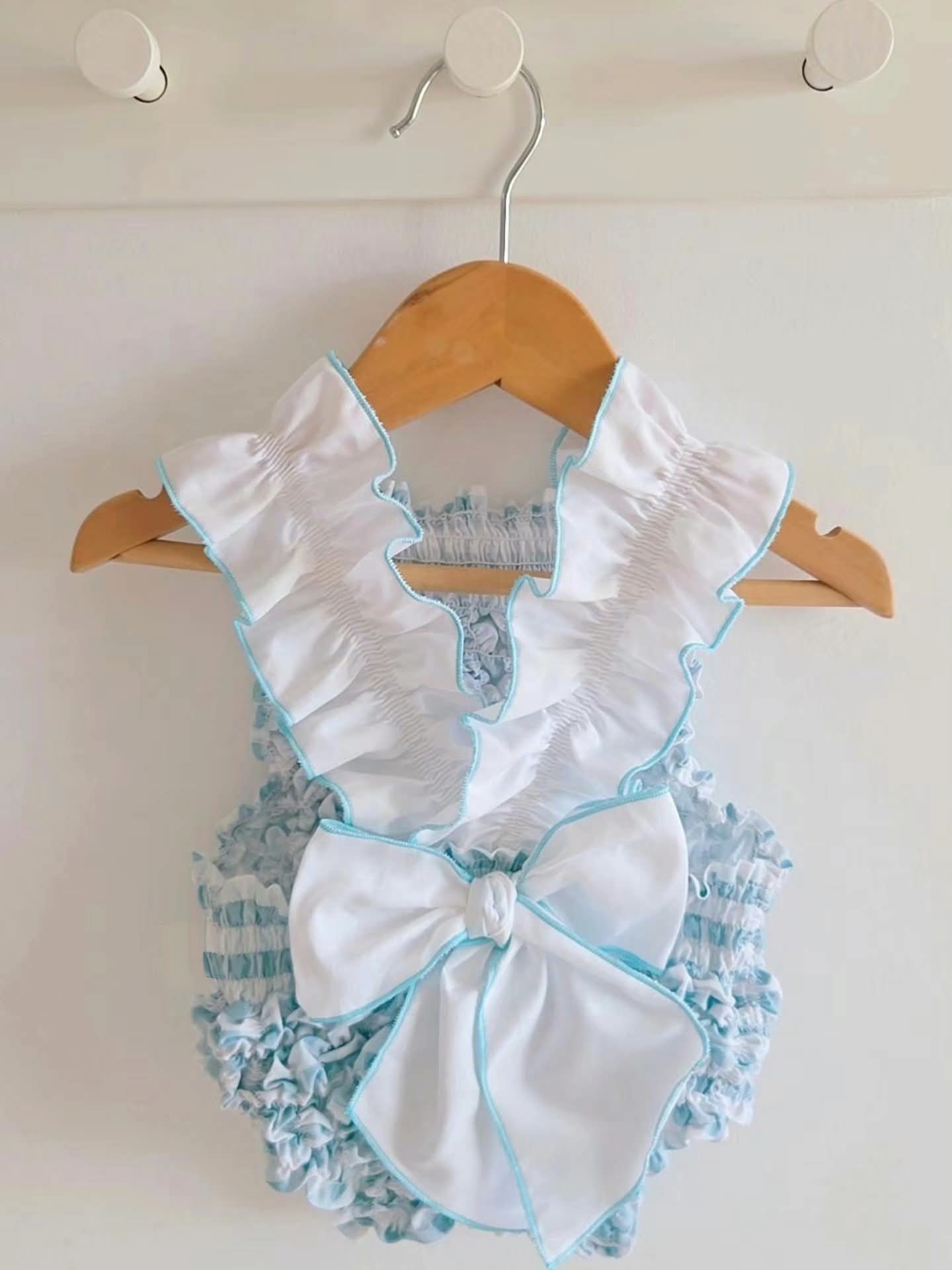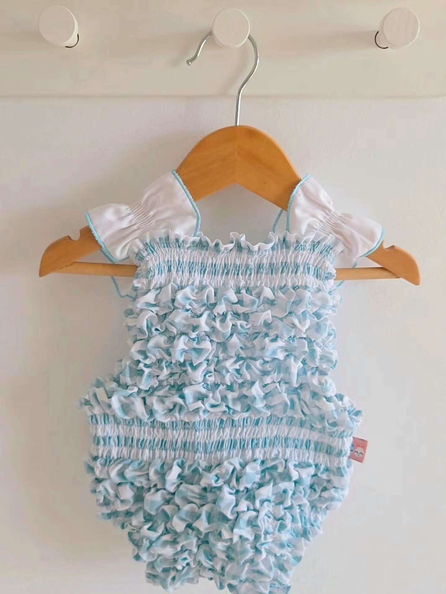 • Macacão de bebé branco e azul claro com folhos pendurado num cabide de madeira