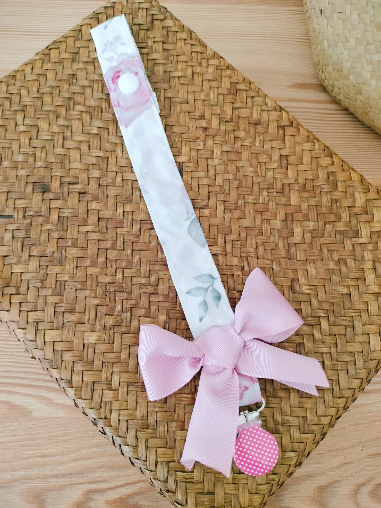 • Prendedor de chupeta branco floral com laço rosa e clip rosa com bolinhas sobre palha trançada