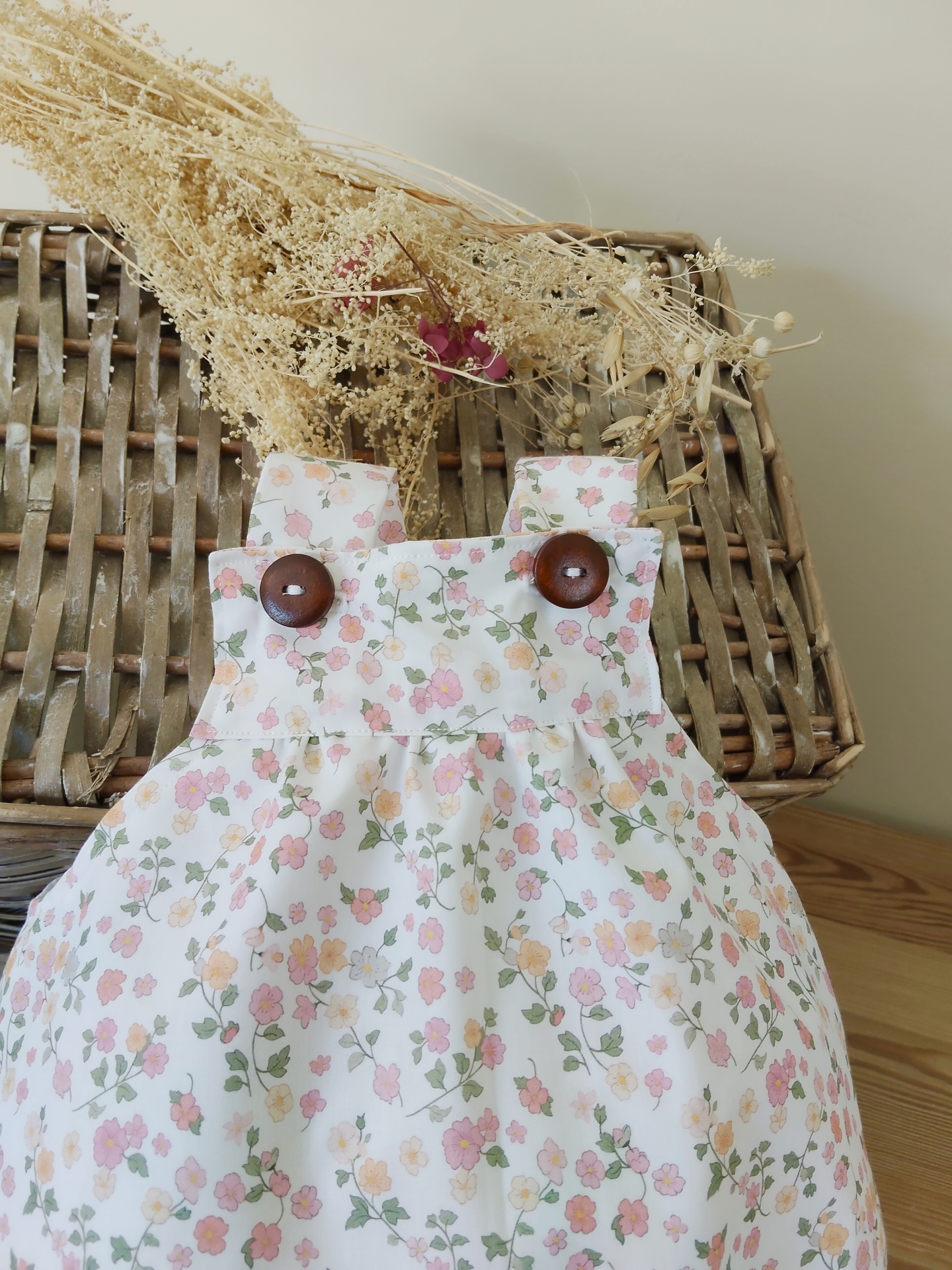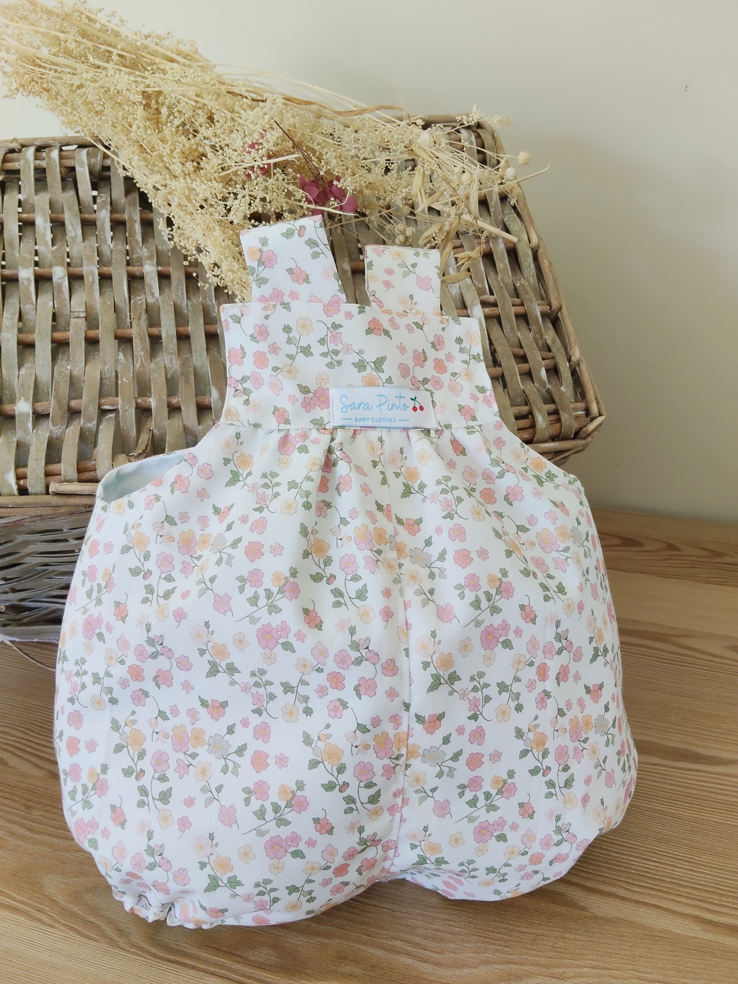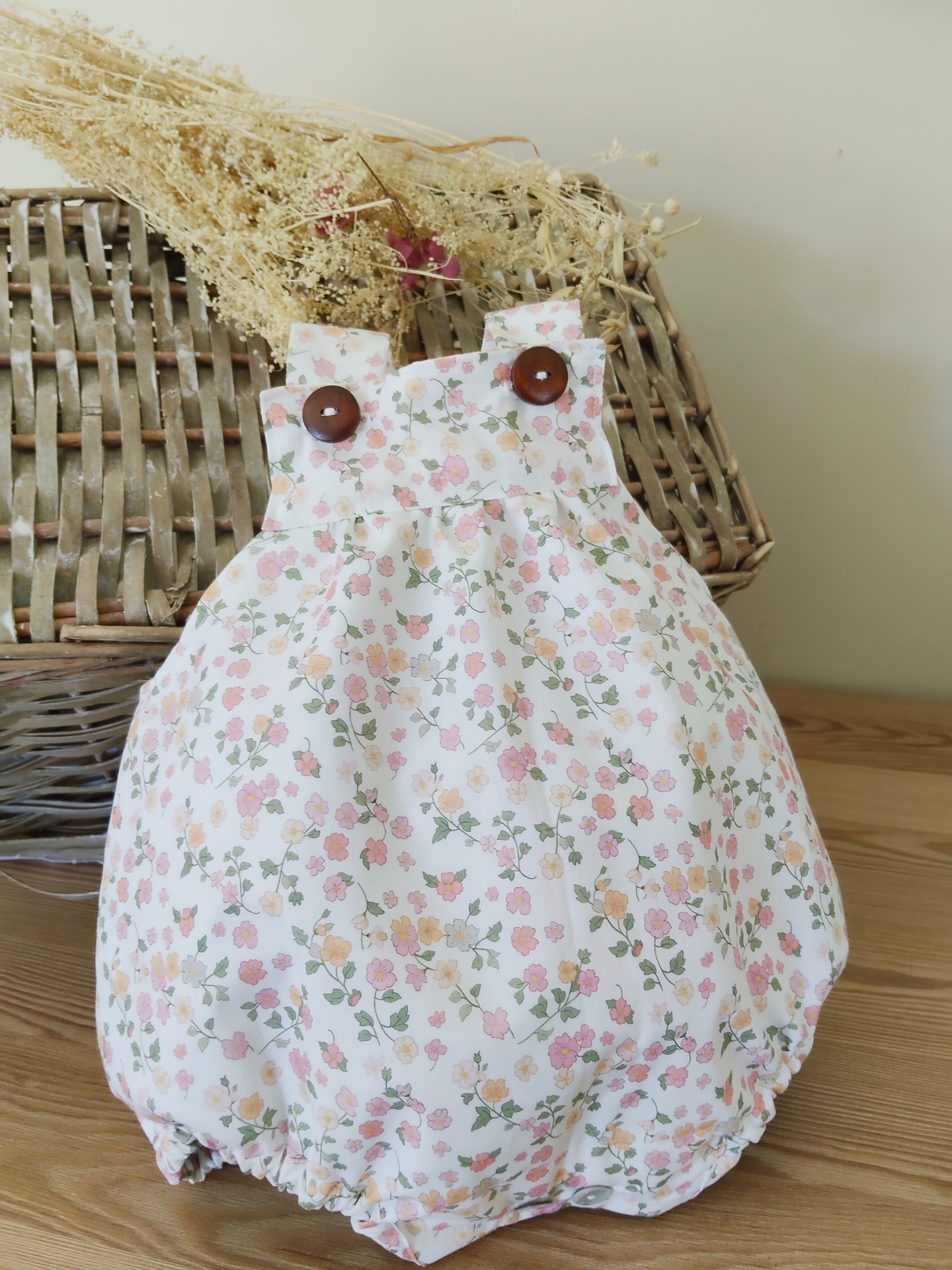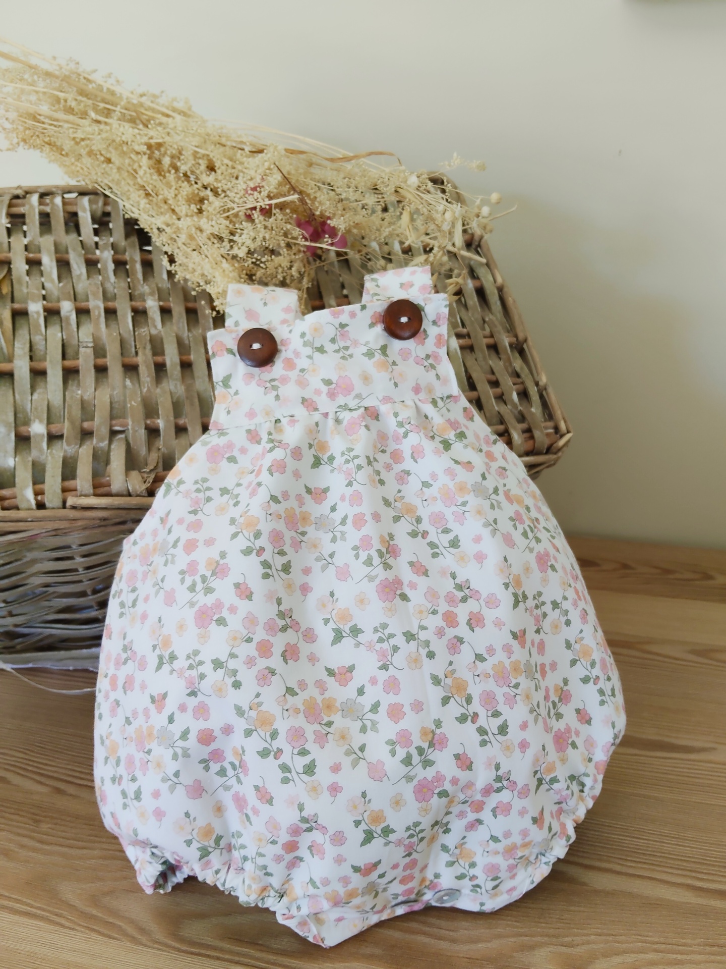 • Macacão curto para bebé com padrão floral em tons pastel colocado sobre bancada de madeira