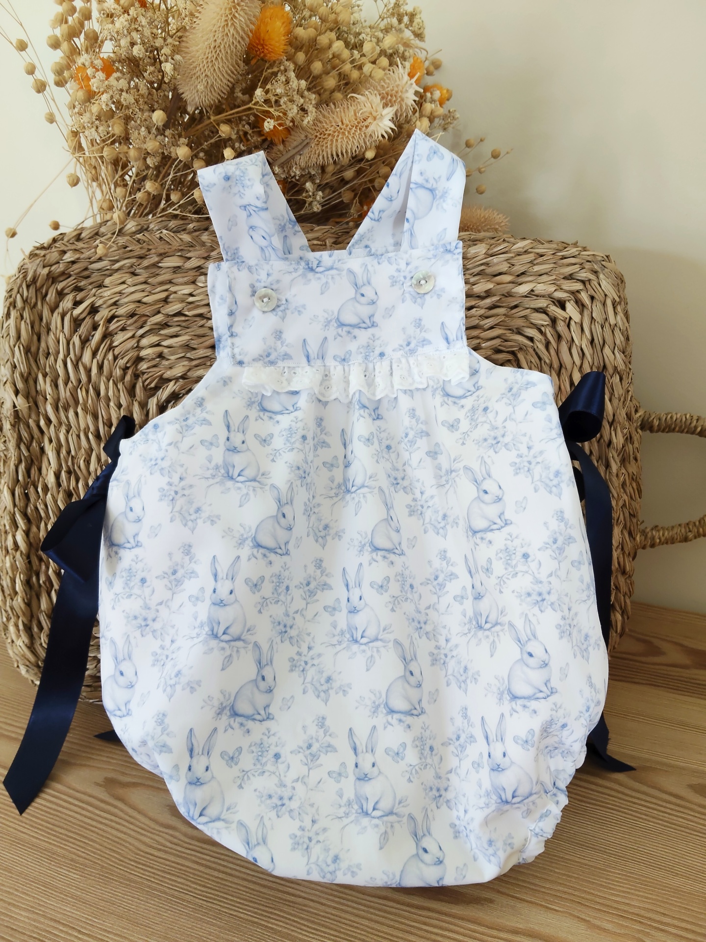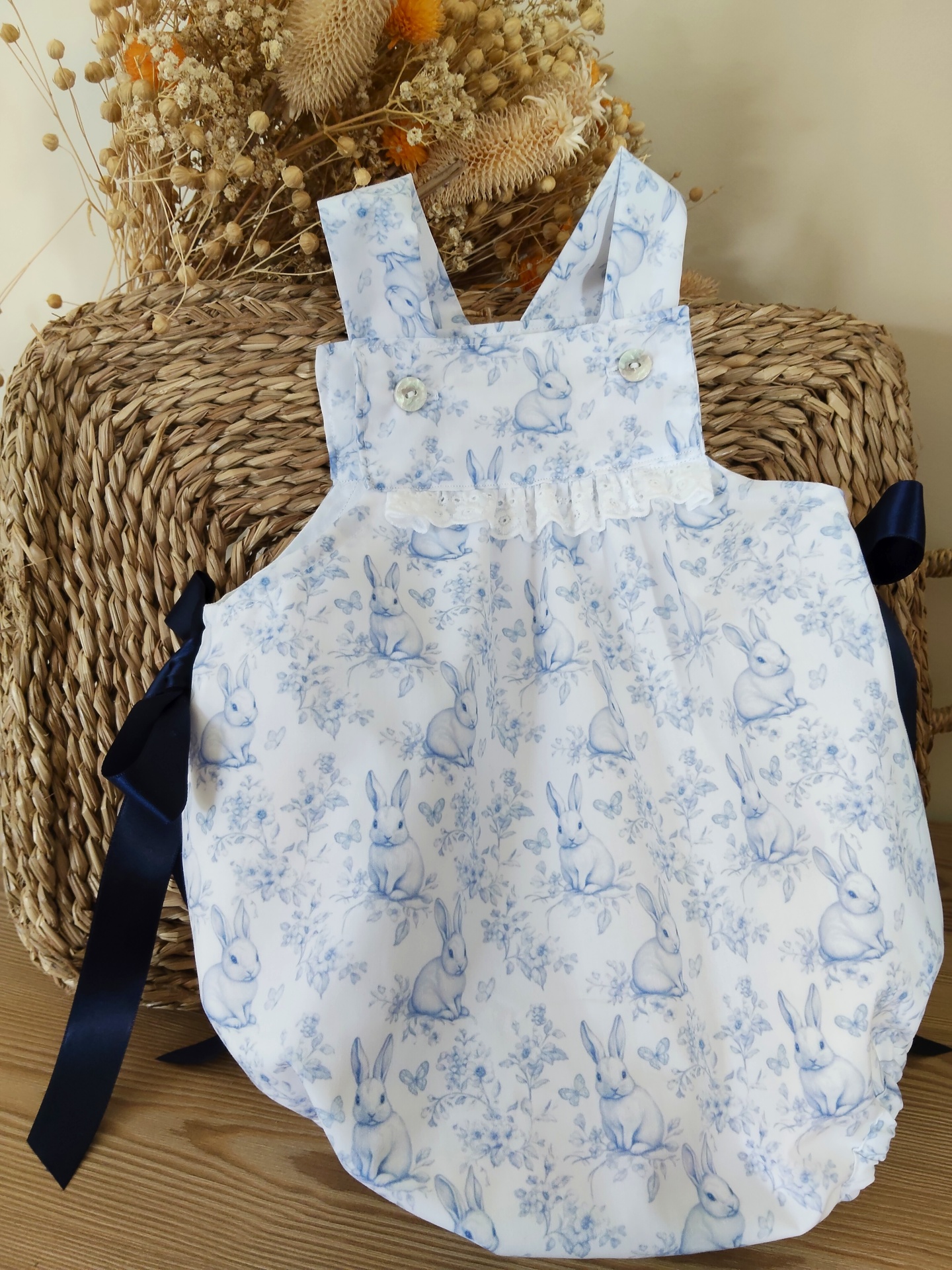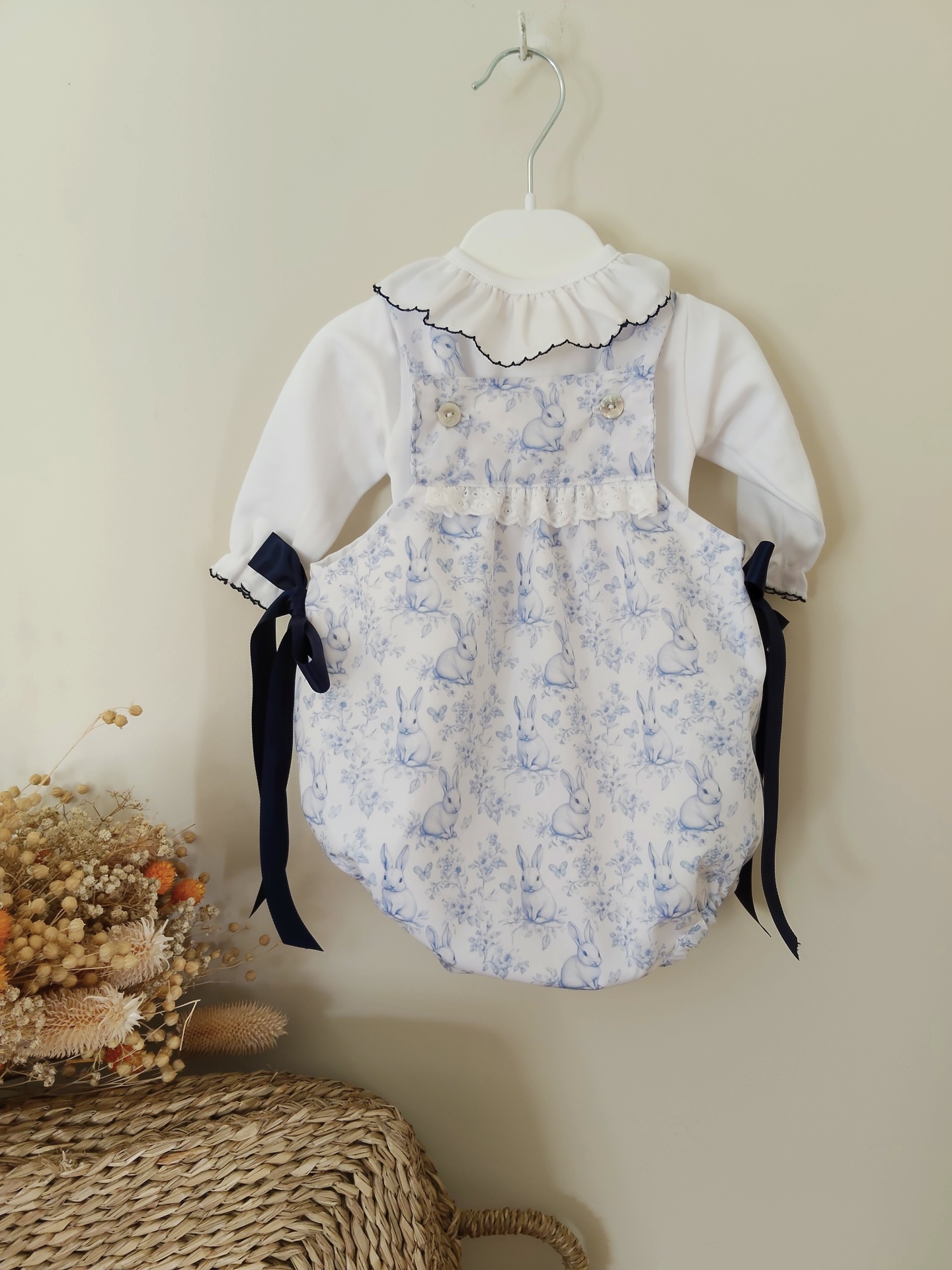 • Jardineira de bebé em tecido branco com padrão de coelhinhos e flores azuis