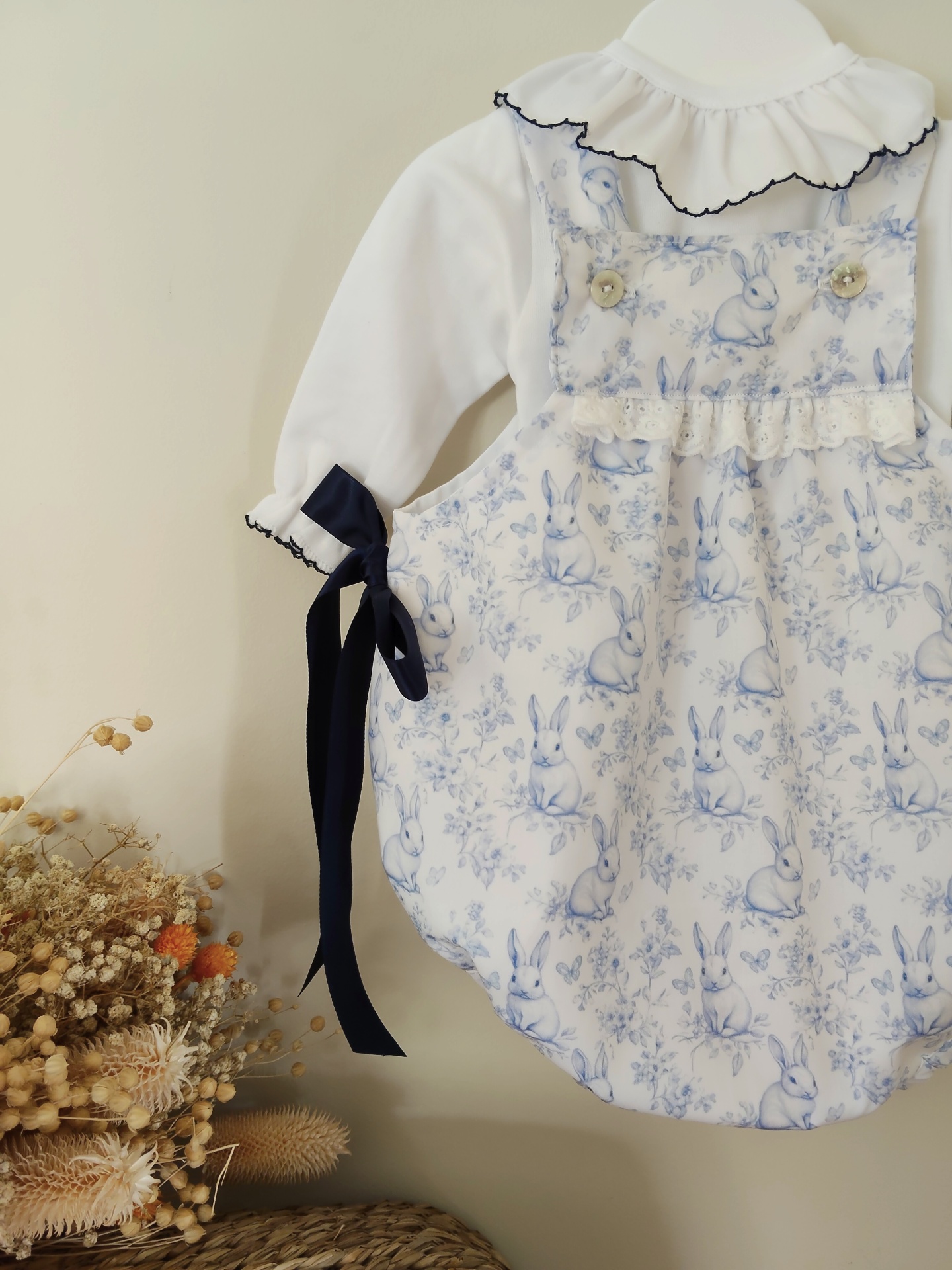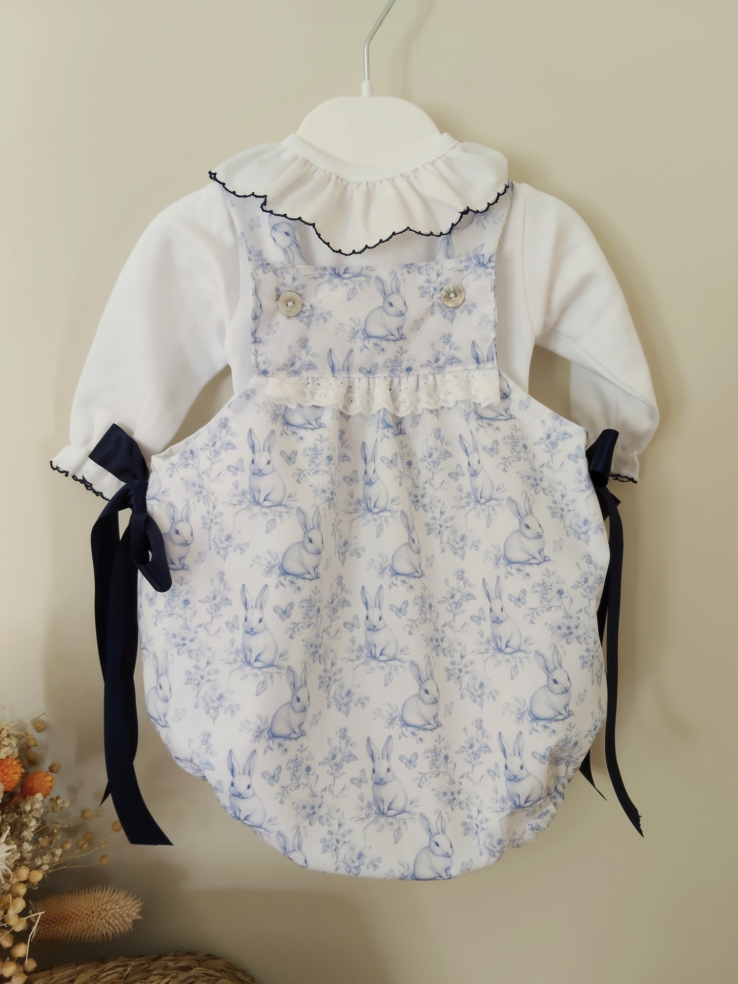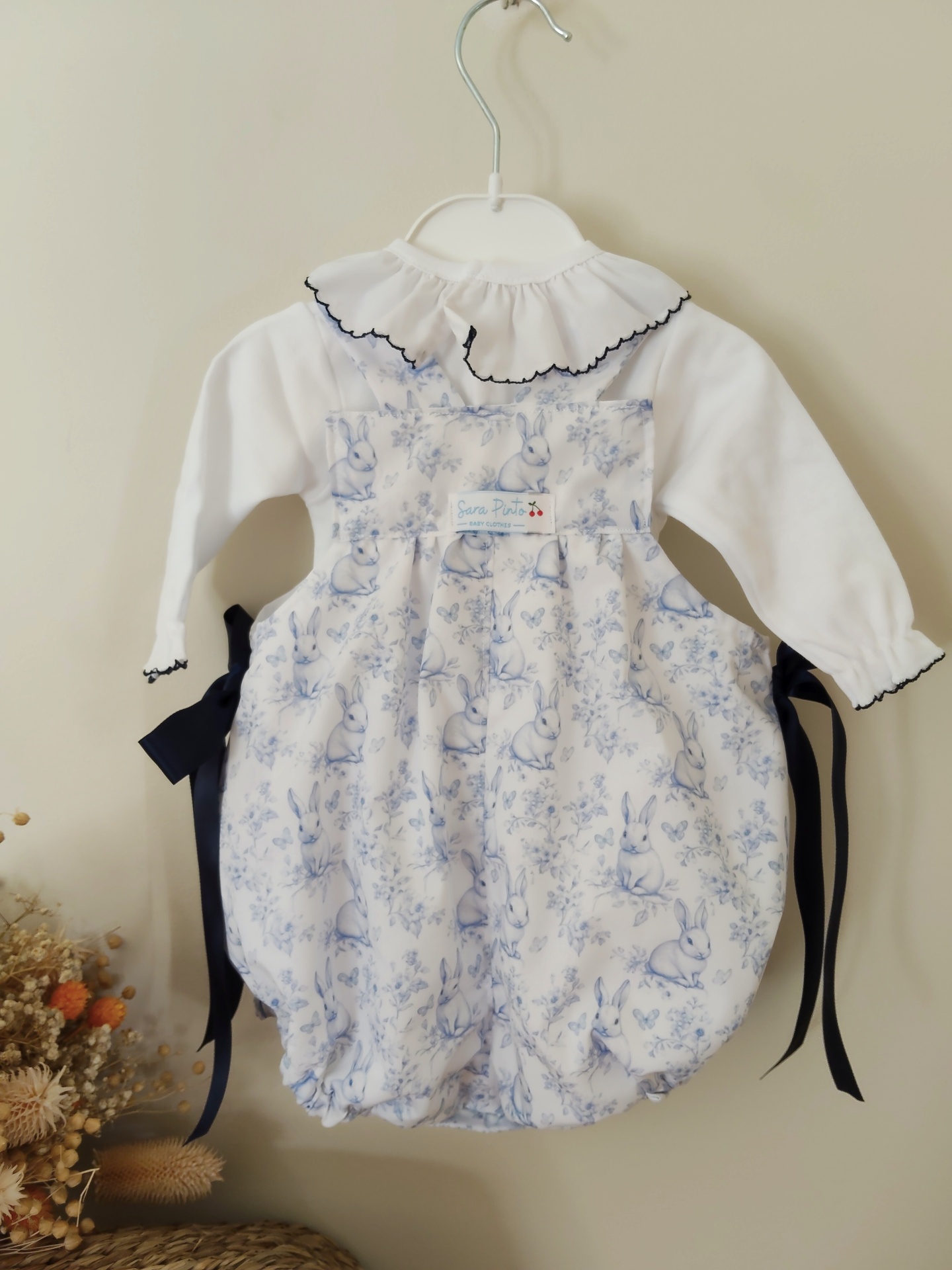• Jardineira de bebé em tecido branco com padrão de coelhinhos e flores azuis