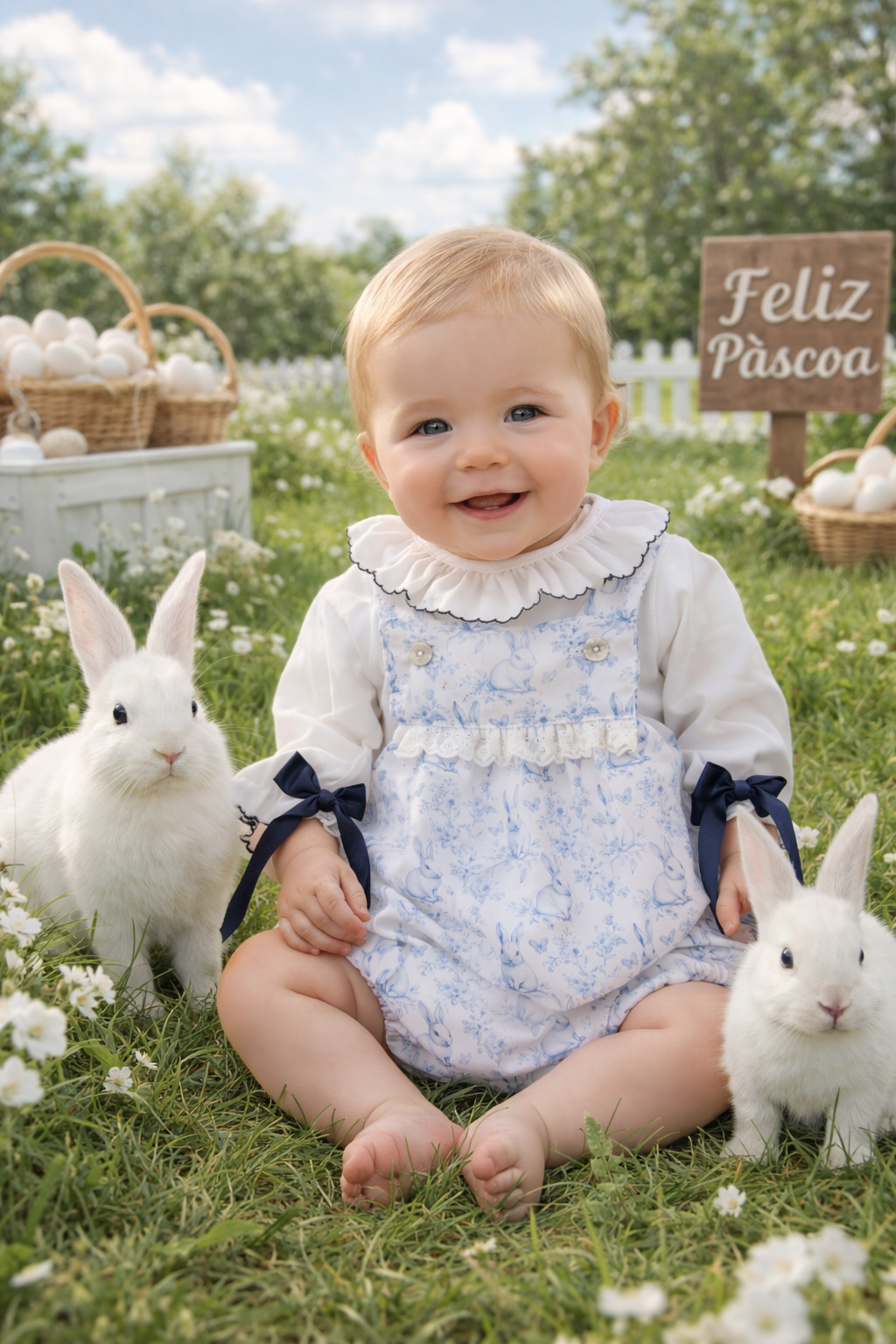 • Bebé com macacão branco e azul sentado na relva com lebres e placa Feliz Pàscoa.