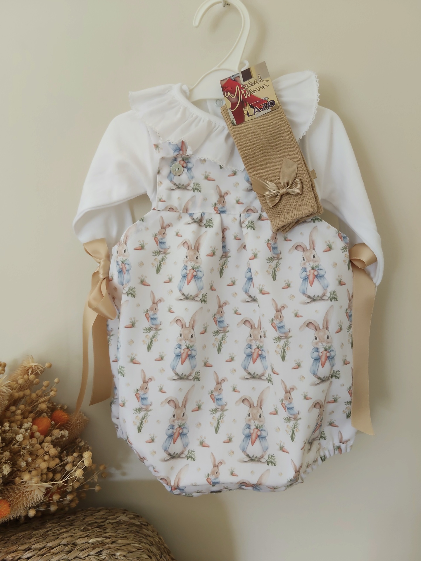 • Roupa de bebé com padrão de coelhos e meias castanhas com laço