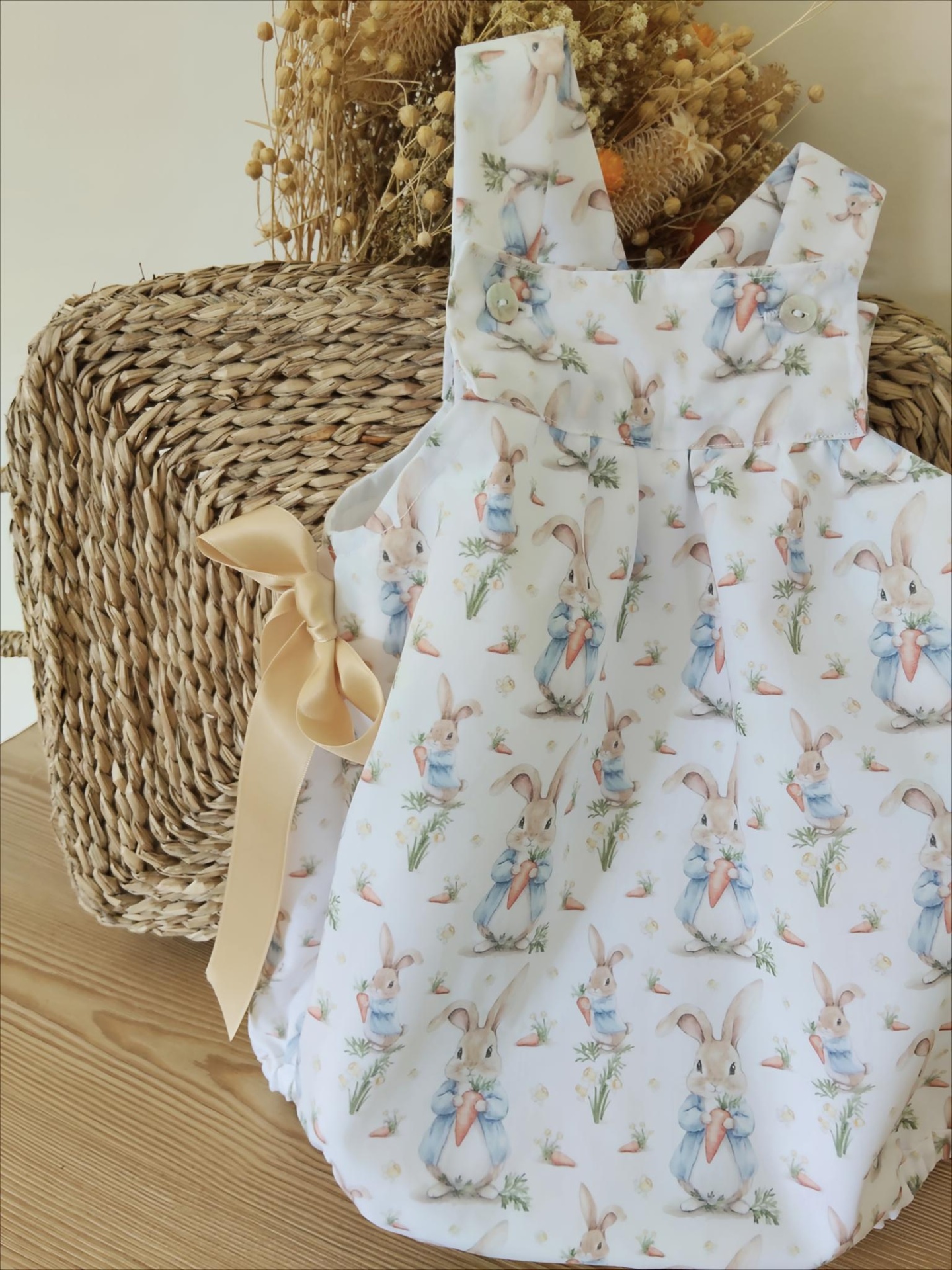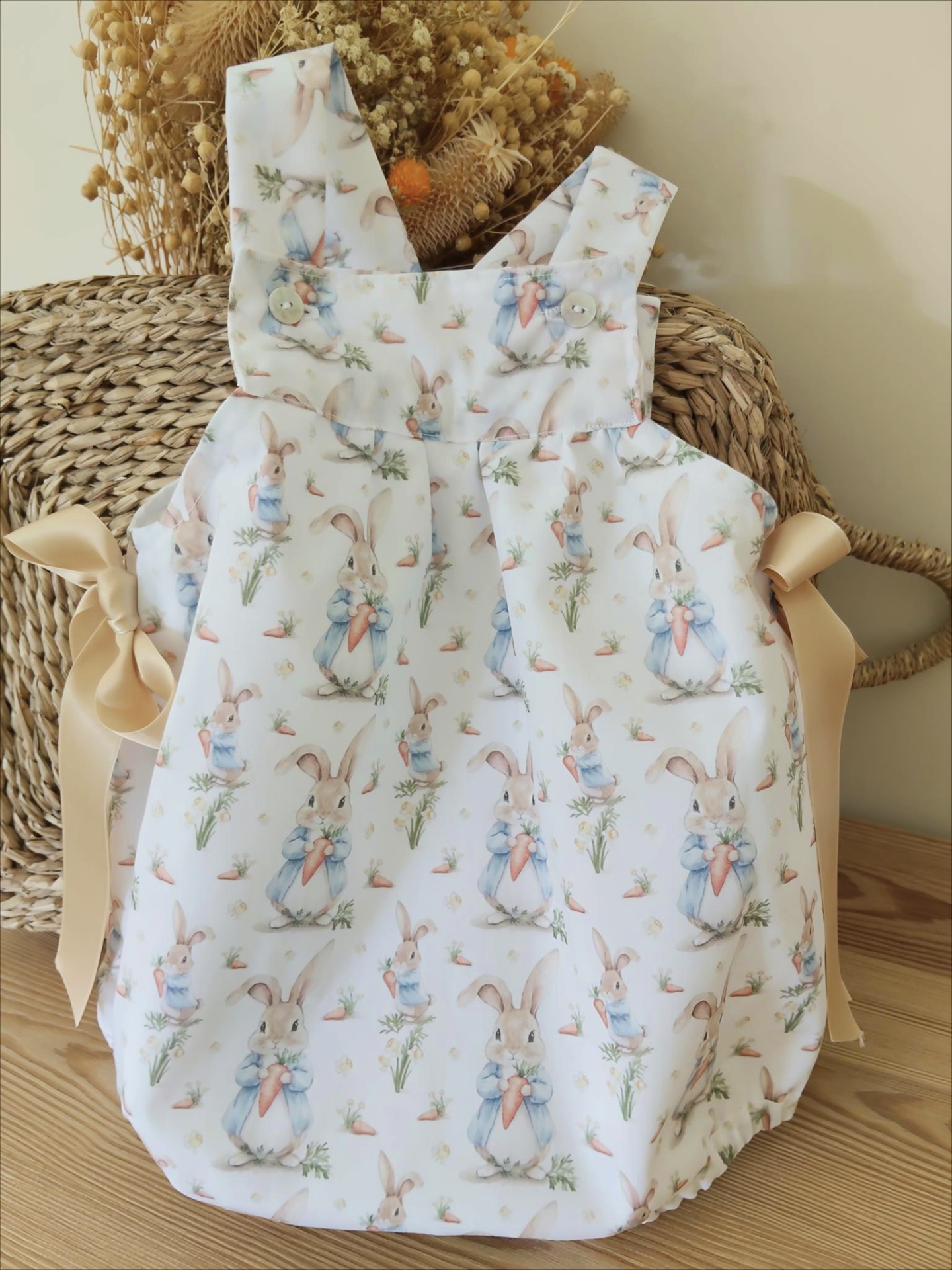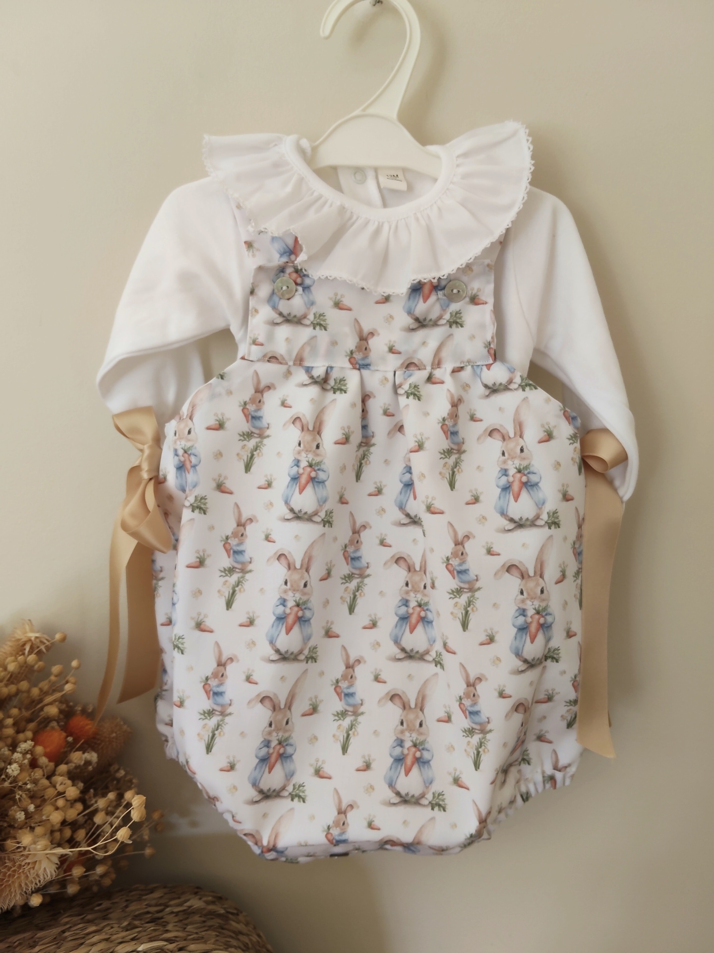 • Macacão de bebé branco com padrão de coelhos e laços bege