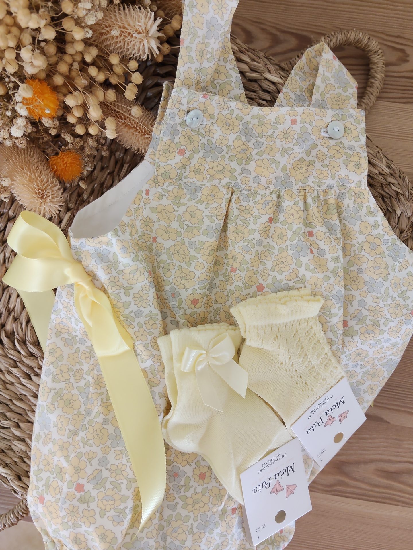 • Jardineira floral amarelo com laço e meias amarelas com etiquetas Mala Peleta