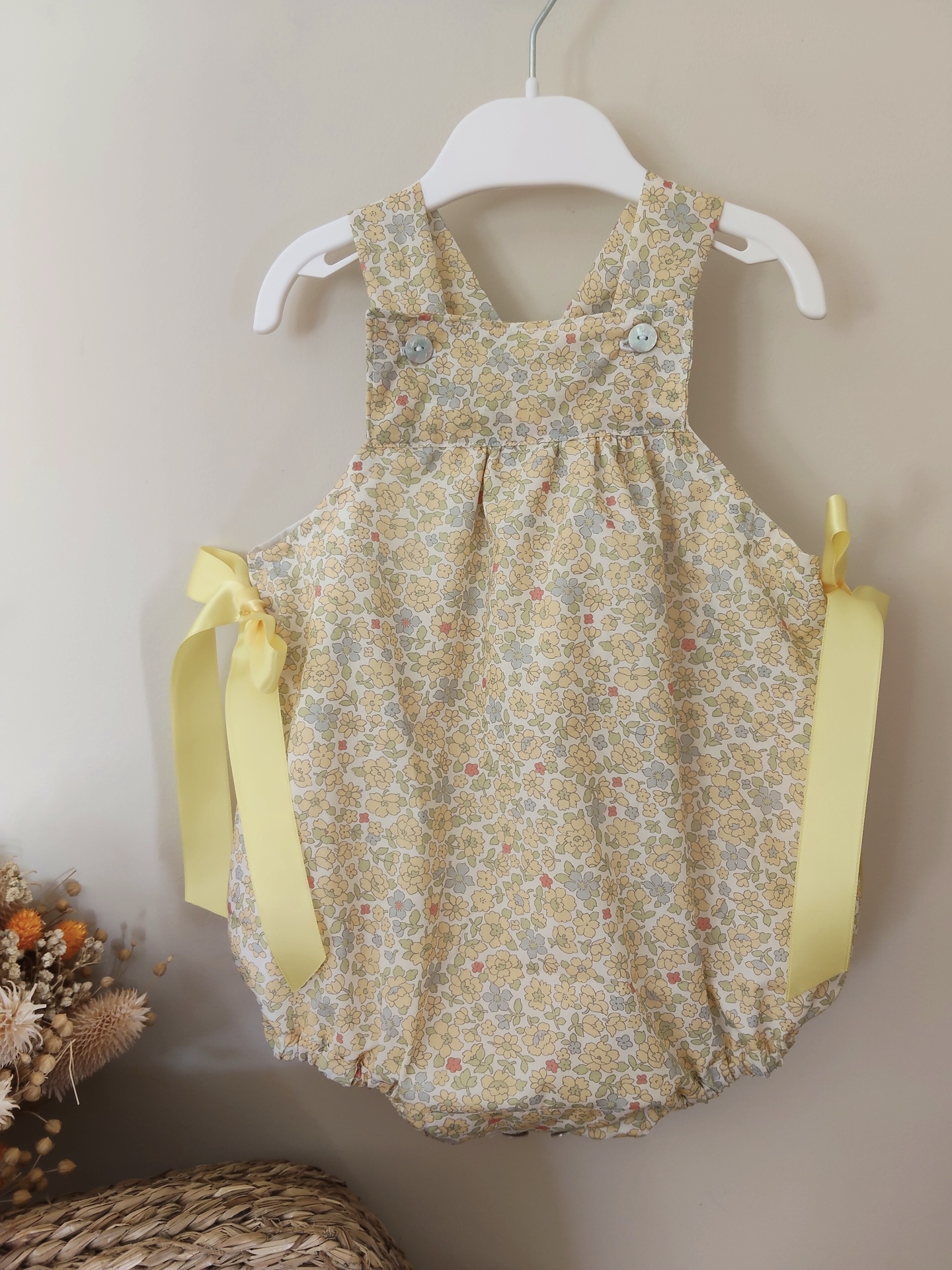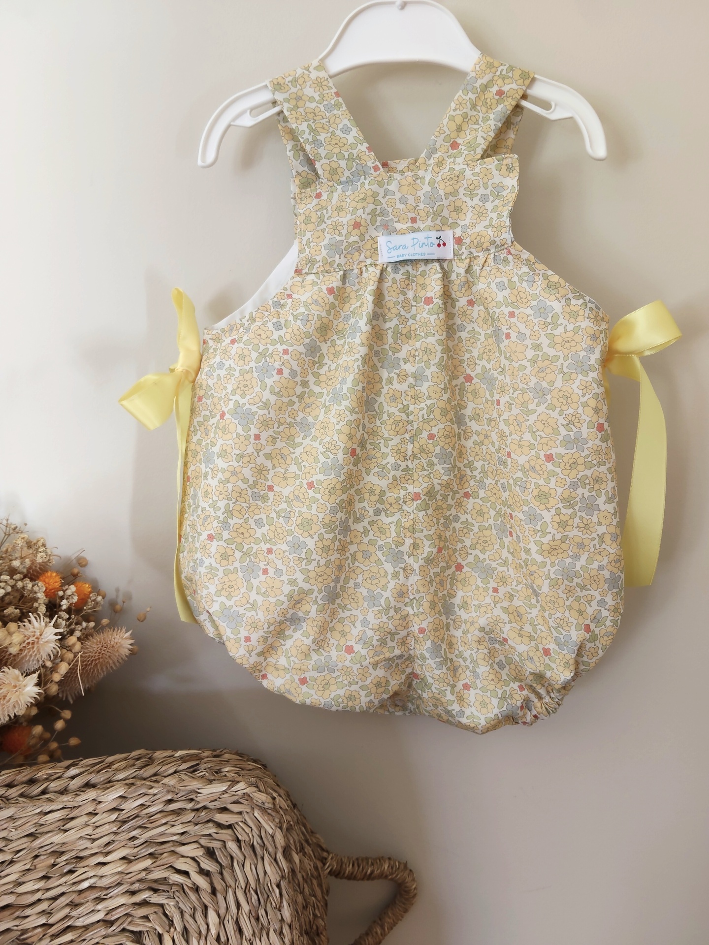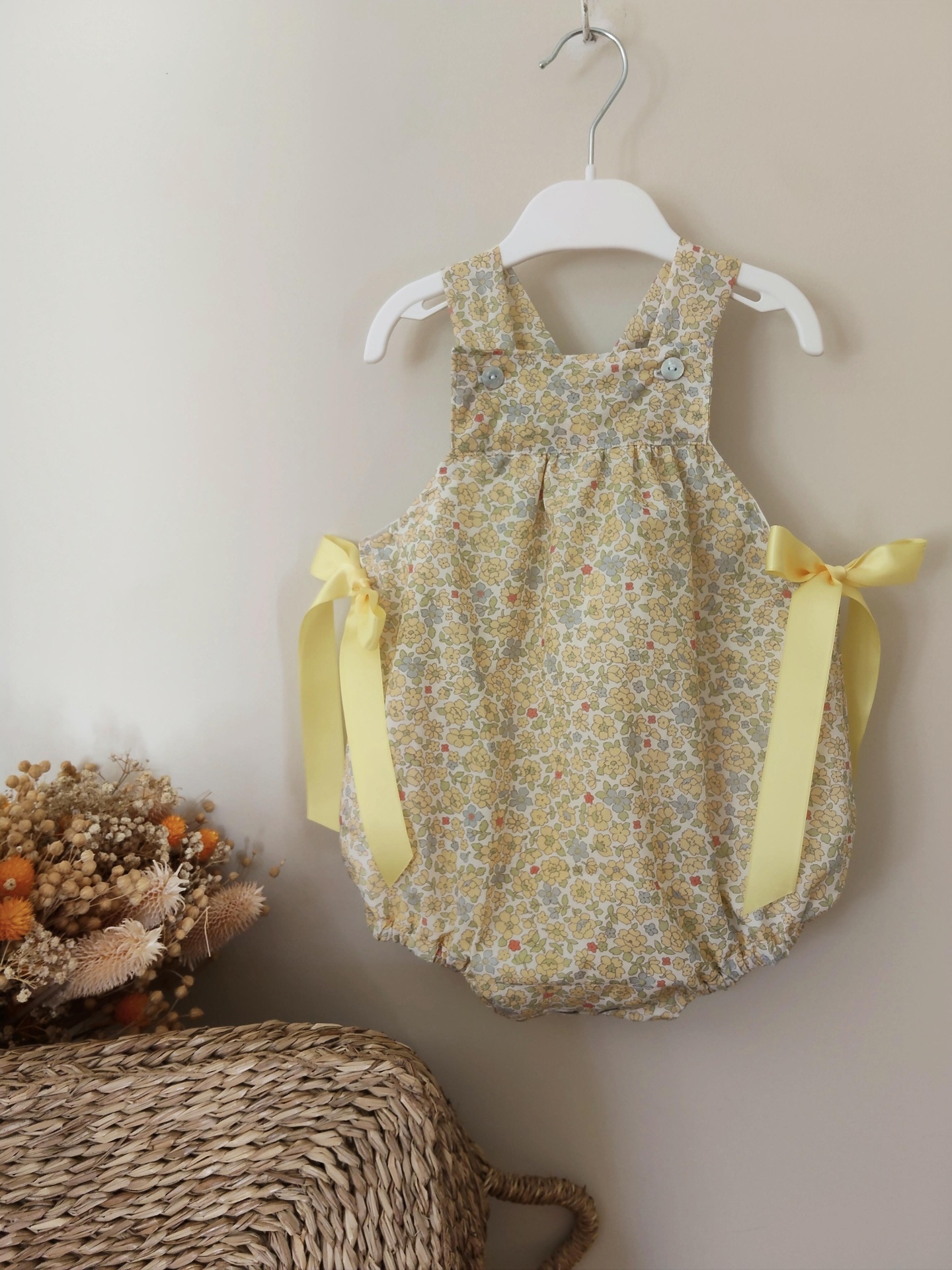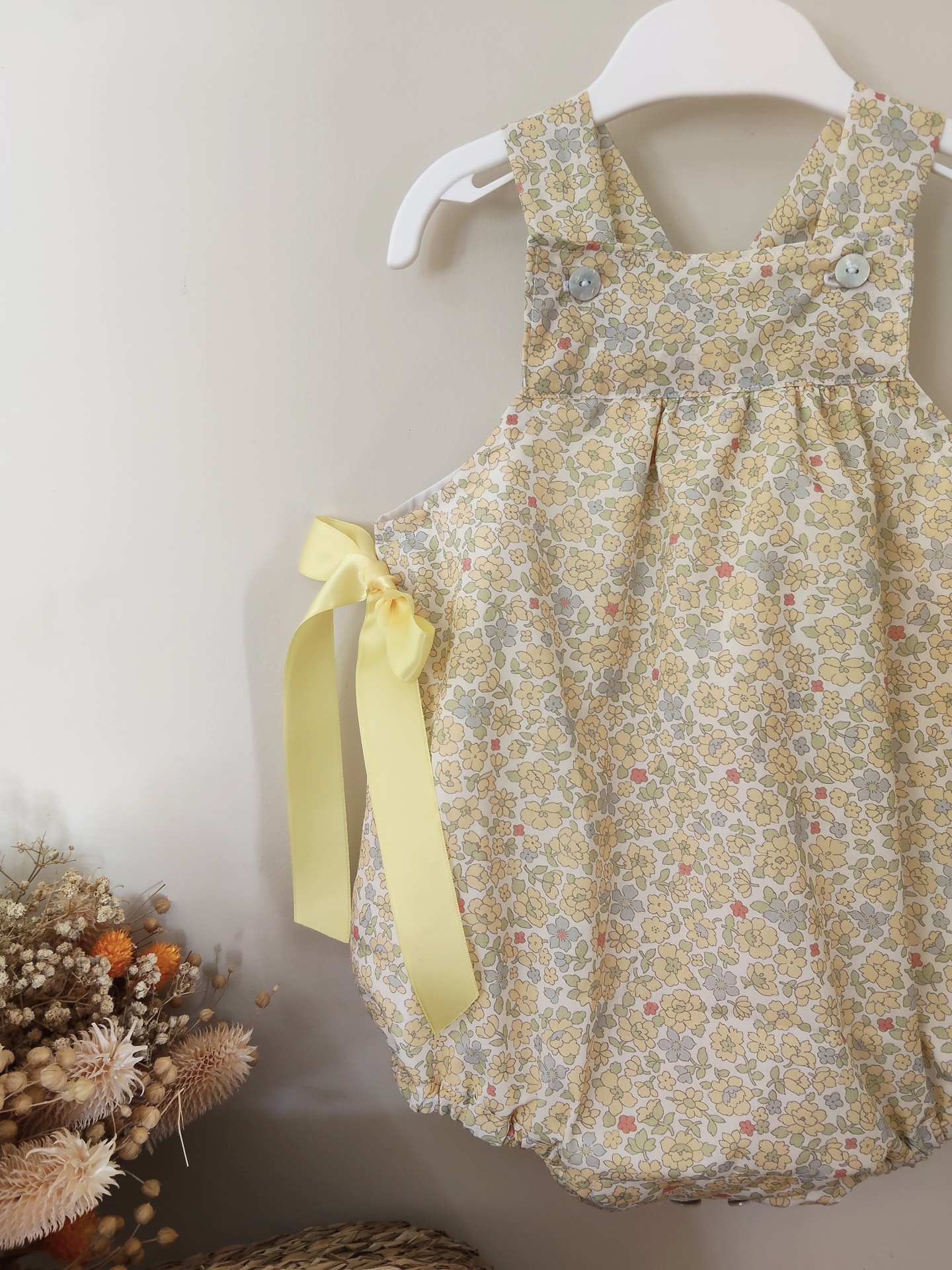 • Macacão floral amarelo com laço pendurado em cabide branco próximo a flores secas.