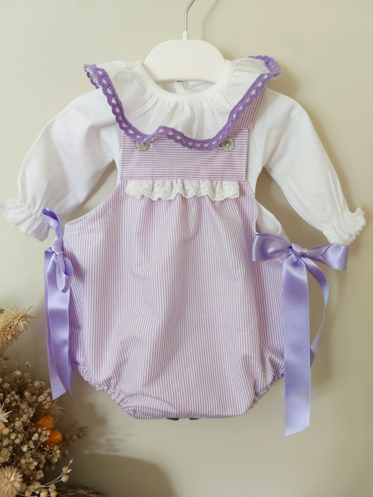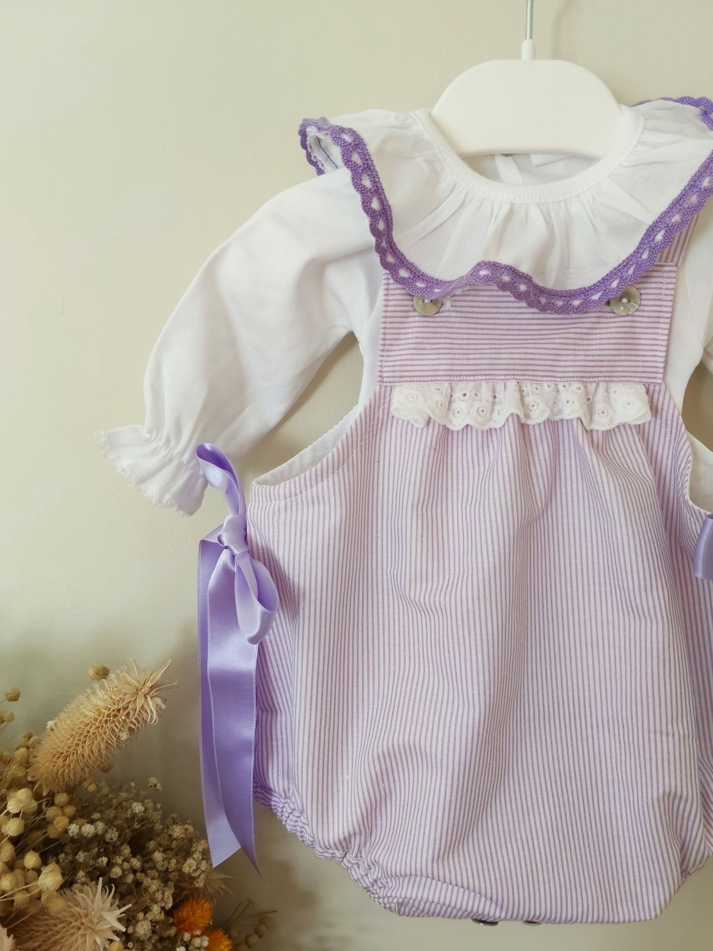 • Body bebé com camisola branca e jardineira riscada lilás com laços