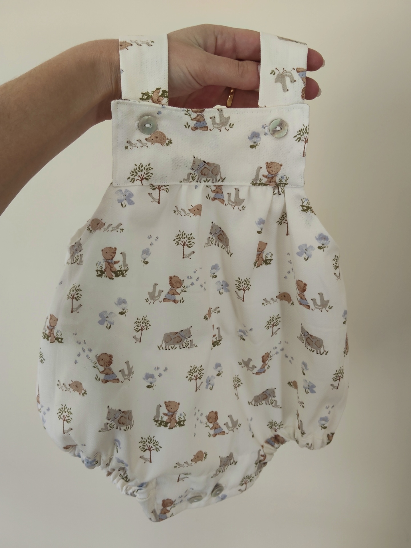 Macacão branco para bebé com padrão de animais e plantas e botões transparentes