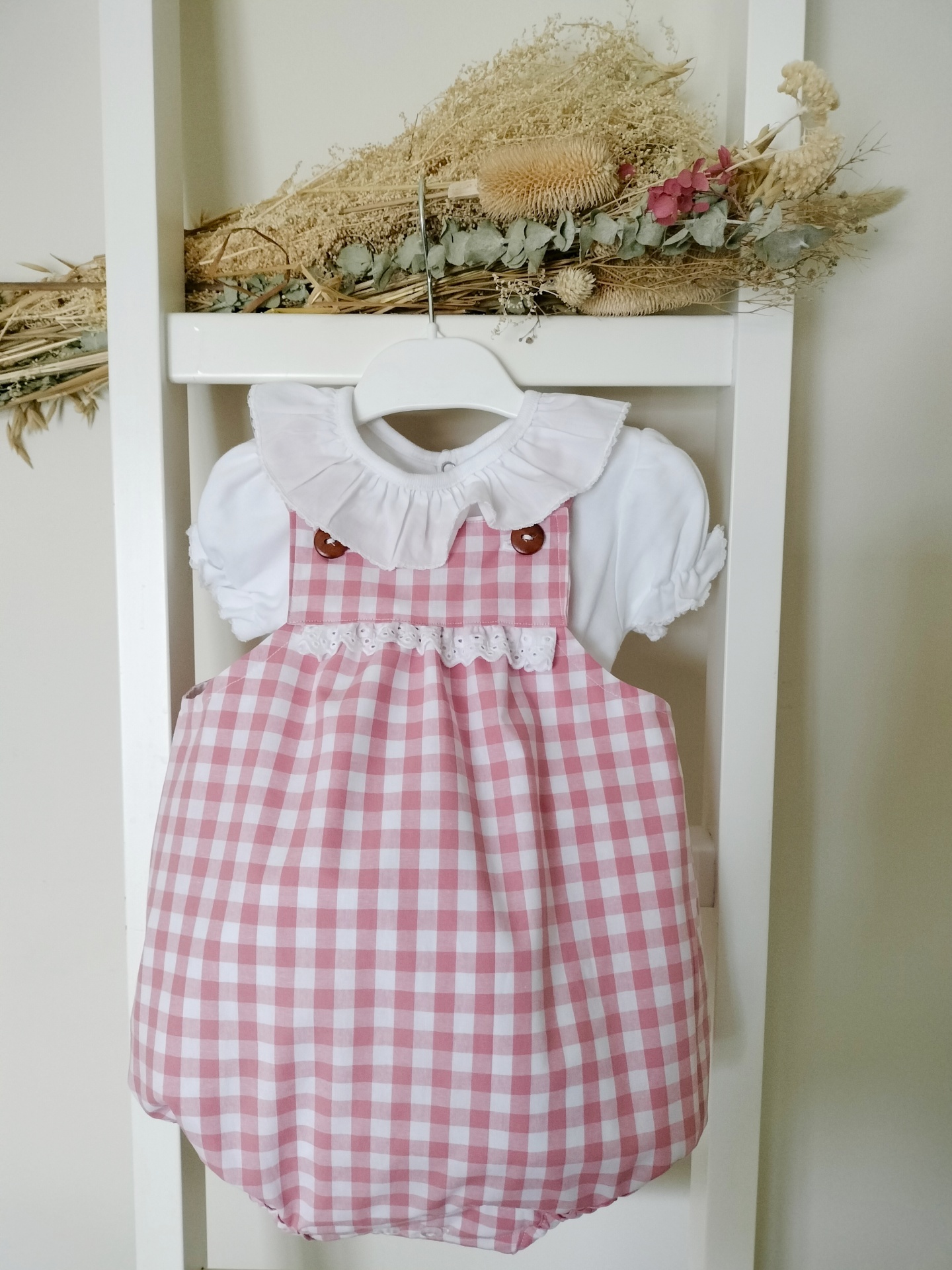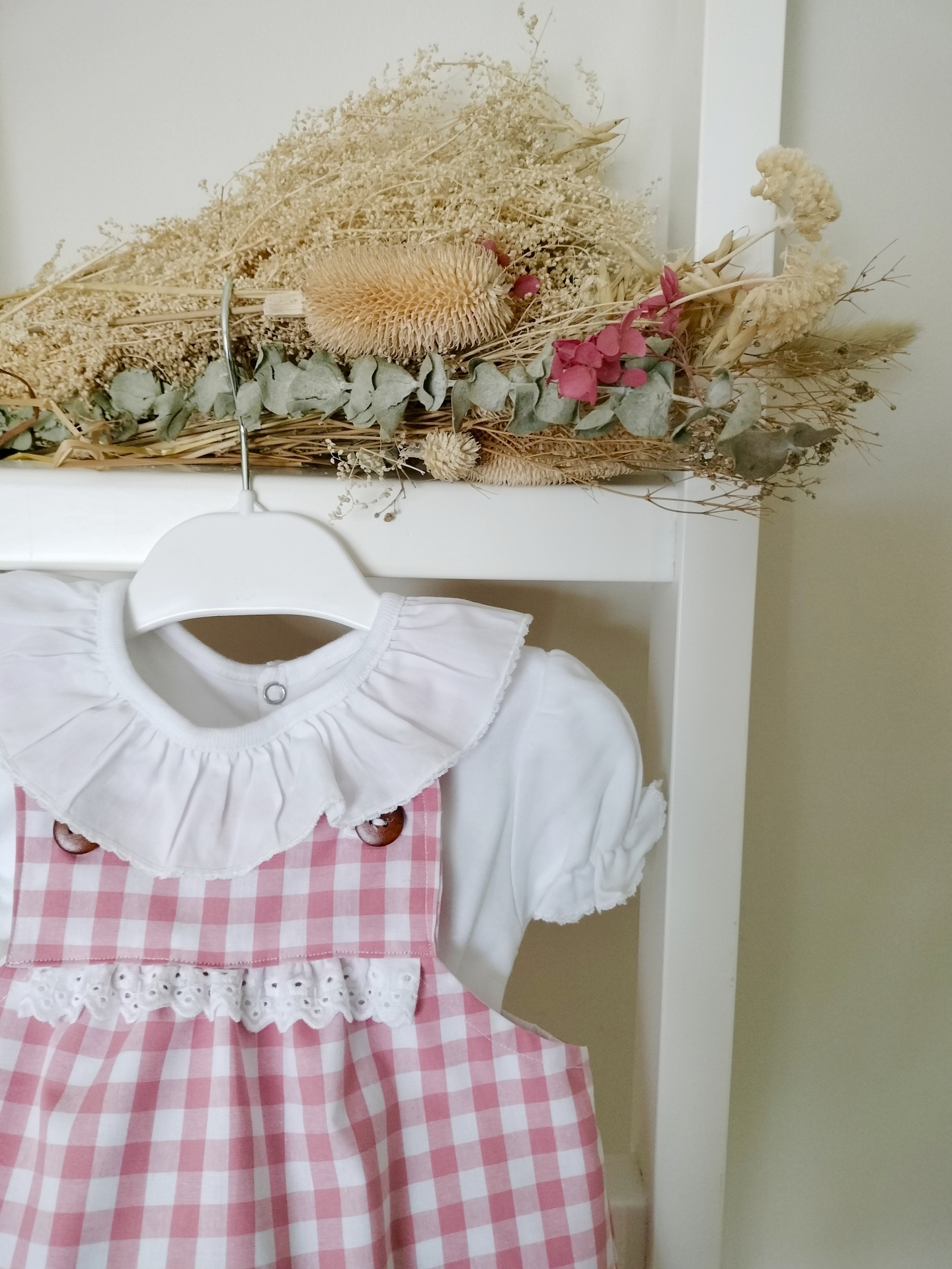 Vestido de bebé rosa e branco com camisa branca pendurado num cabide com plantas secas ao fundo