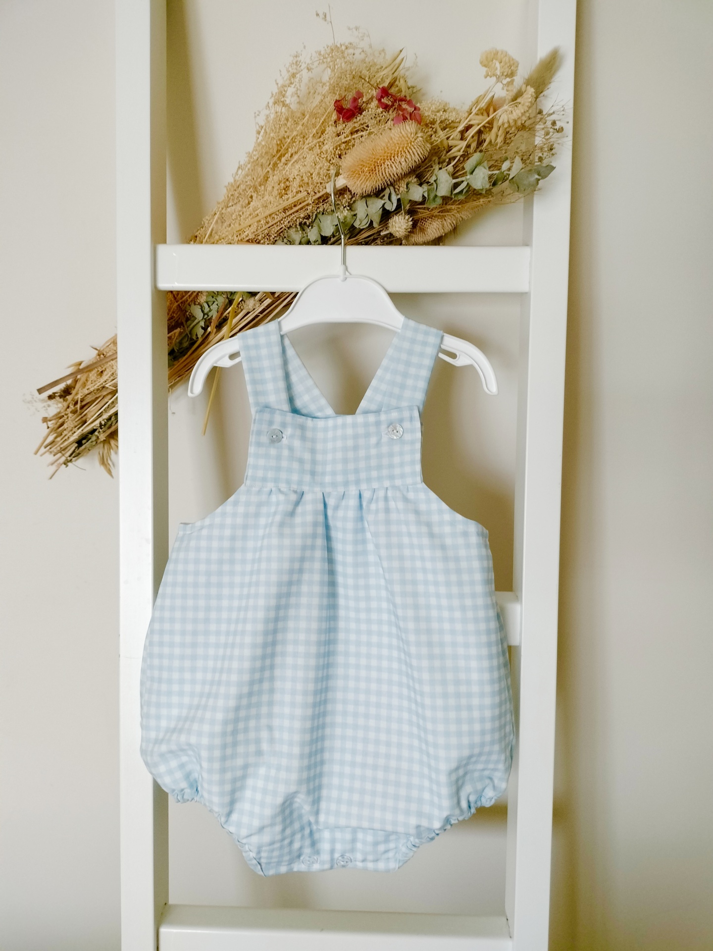 • Macacão bebé xadrez azul e branco com alças pendurado num cabide branco