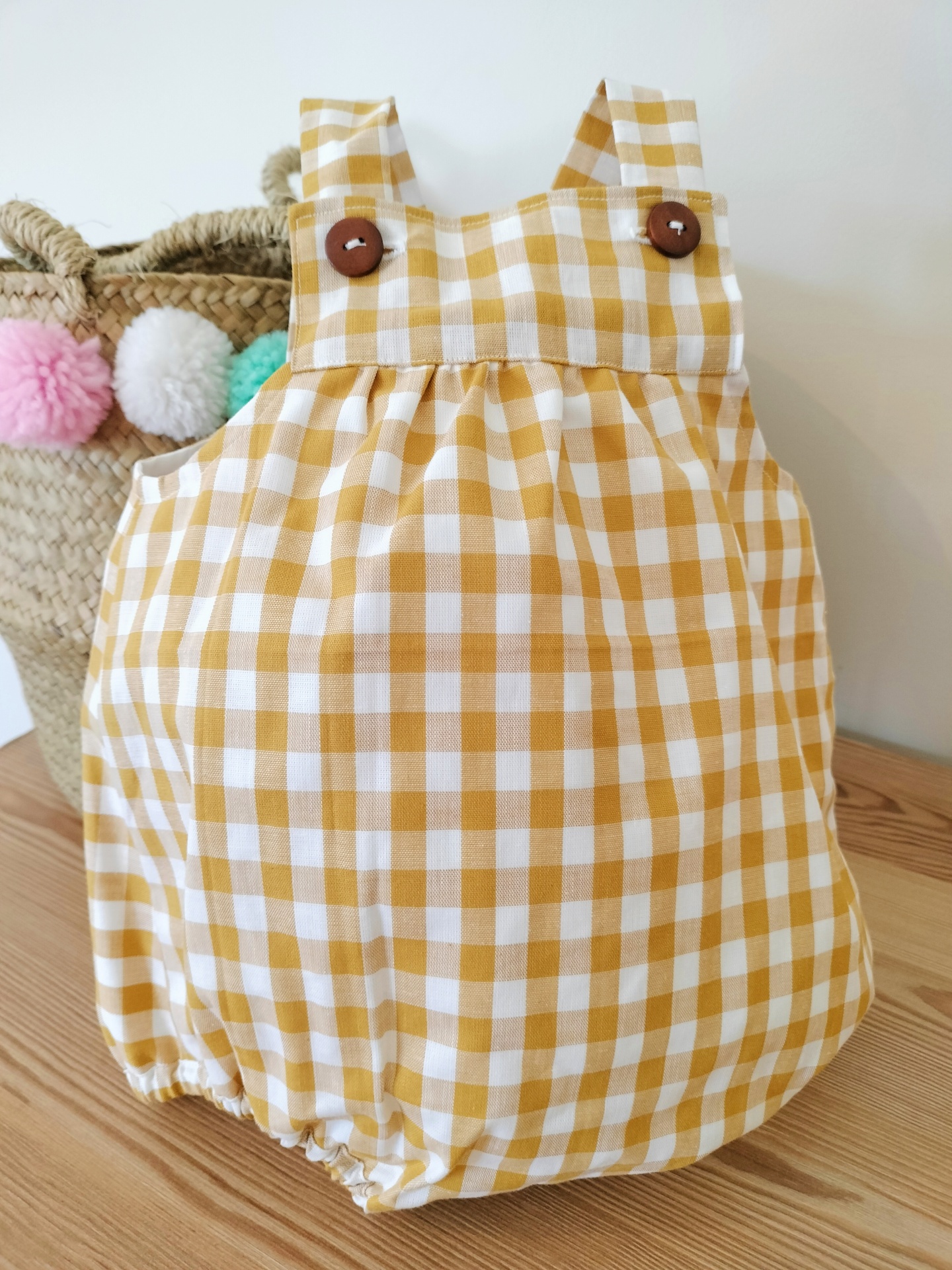 • Macacão xadrez amarelo e branco para bebé com alças e botões castanhos