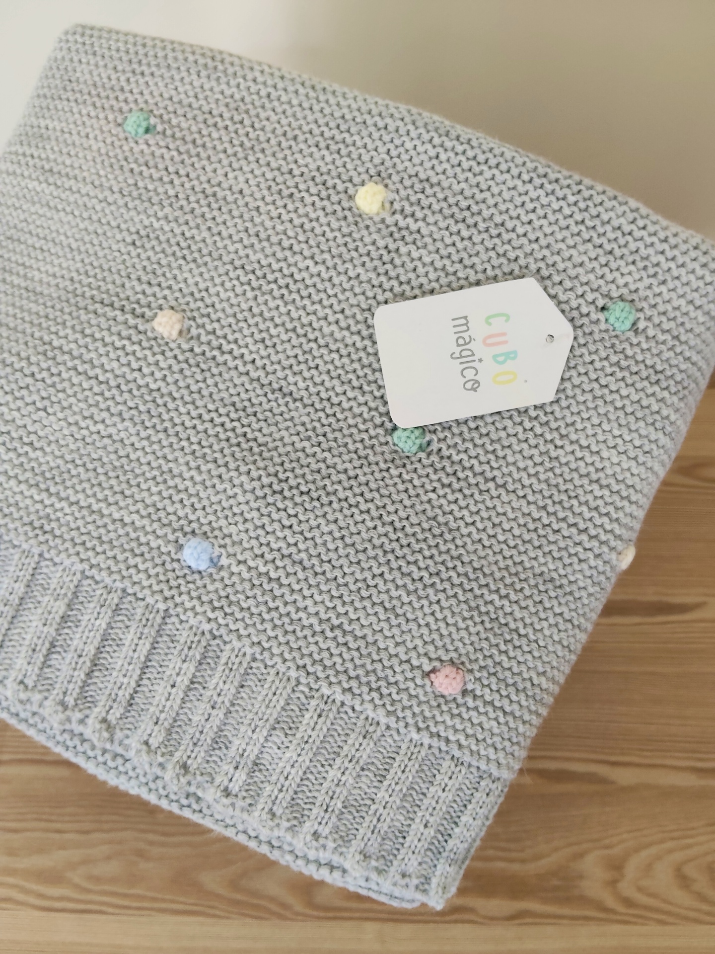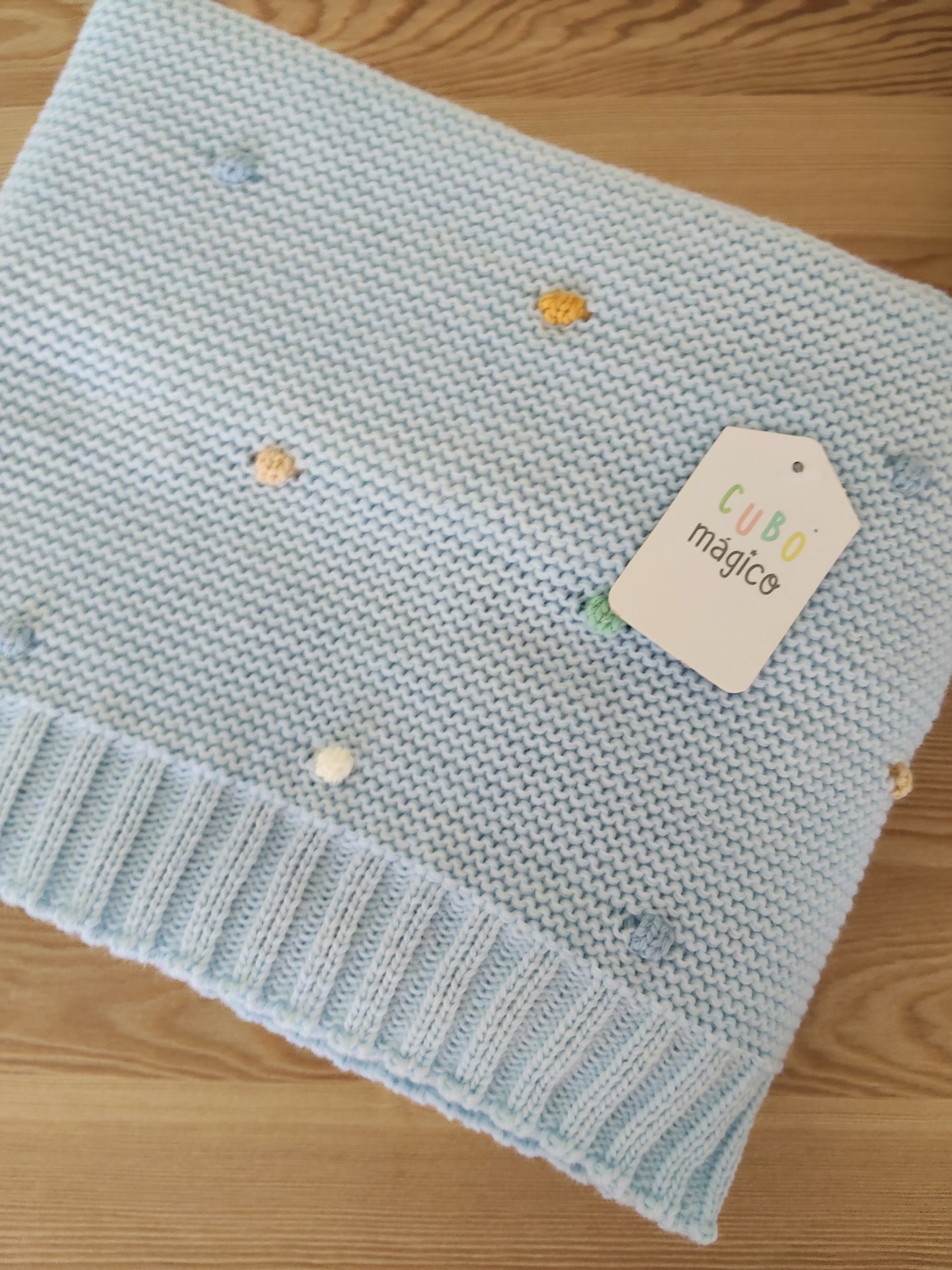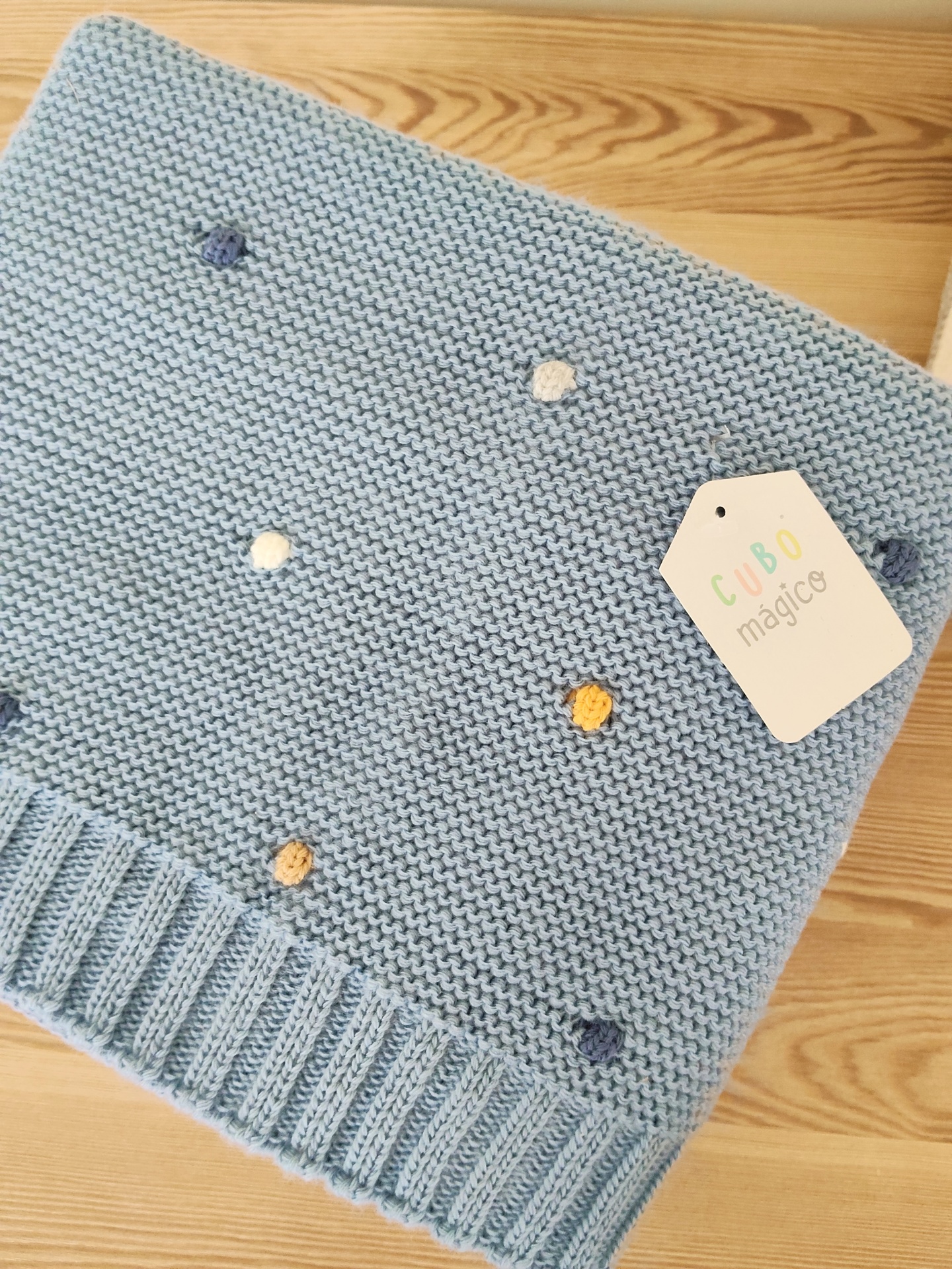 • Manta azul clara de malha com pompons coloridos e etiqueta CUBO mágico