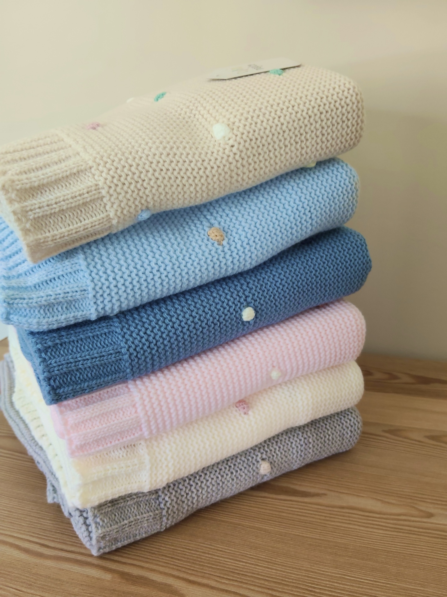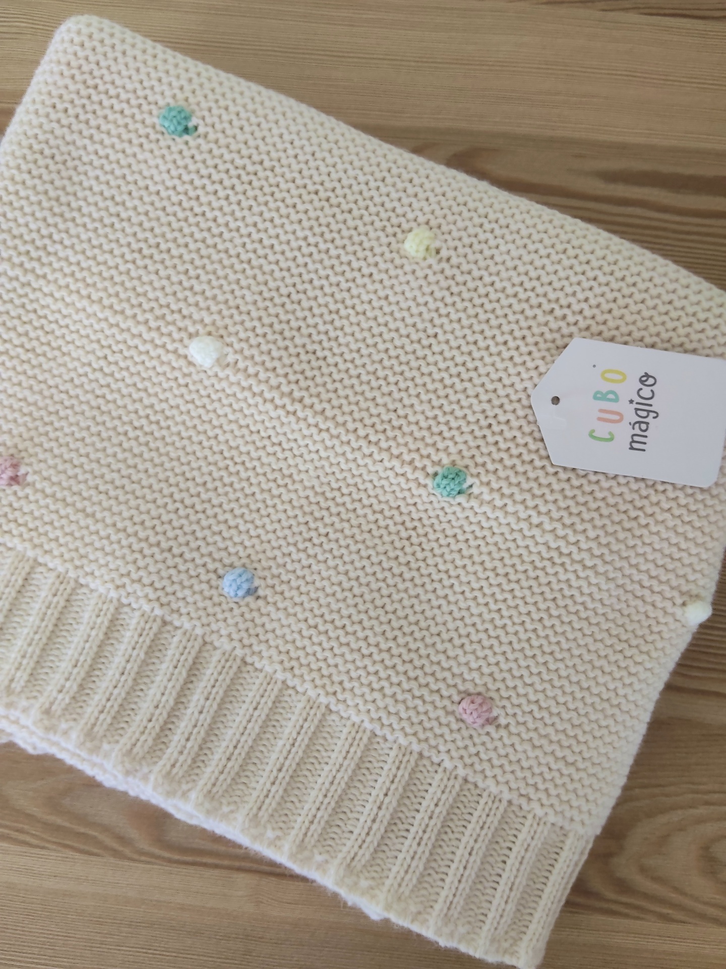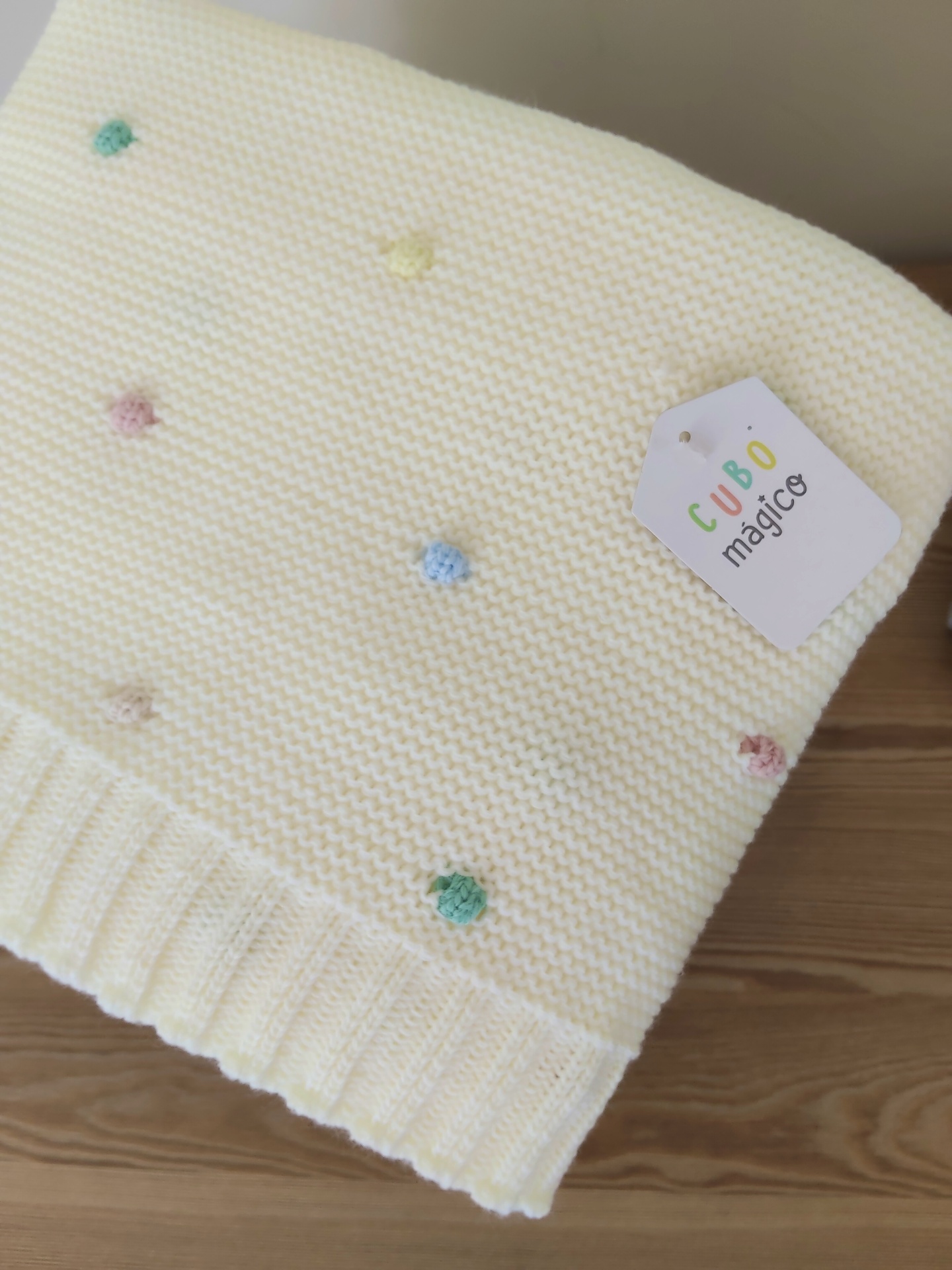 • Manta azul clara de malha com pompons coloridos e etiqueta CUBO mágico