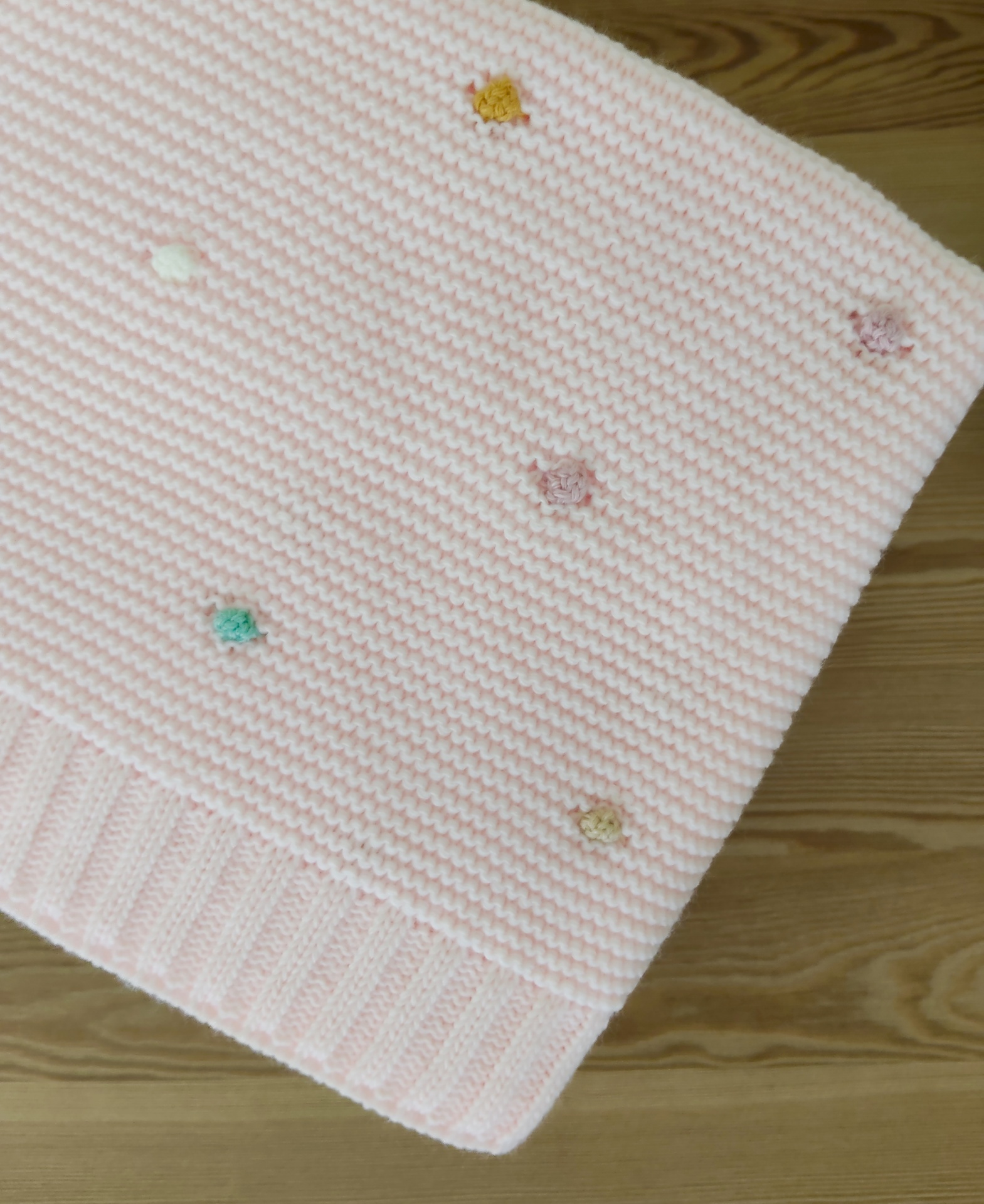 • Manta cor-de-rosa com pontos coloridos sobre madeira clara