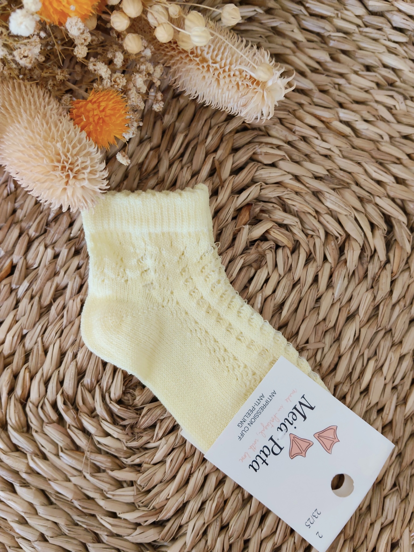 Meia amarela clara de malha com etiqueta branca sobre tapete de fibra natural com flores secas