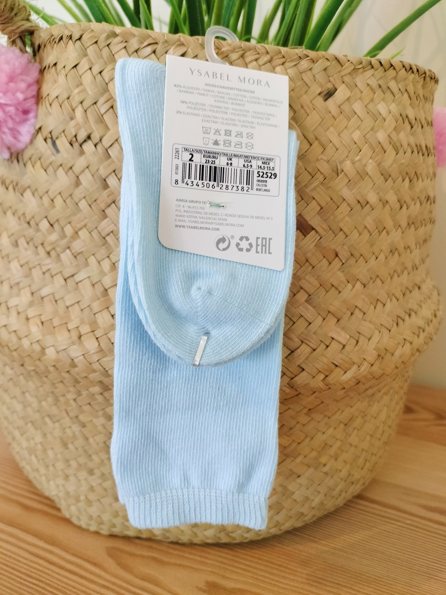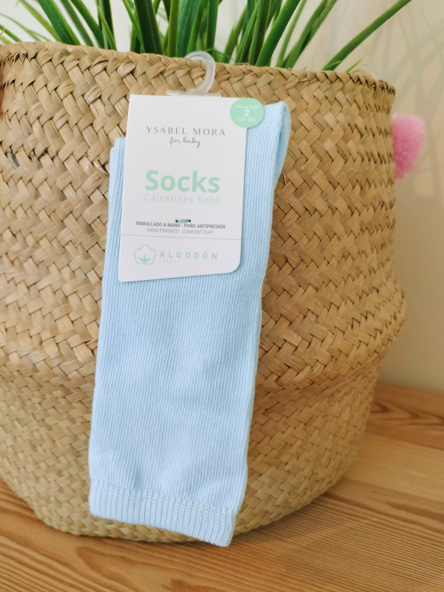 • Meia azul clara Ysabel Mora com etiqueta em cesta de palha