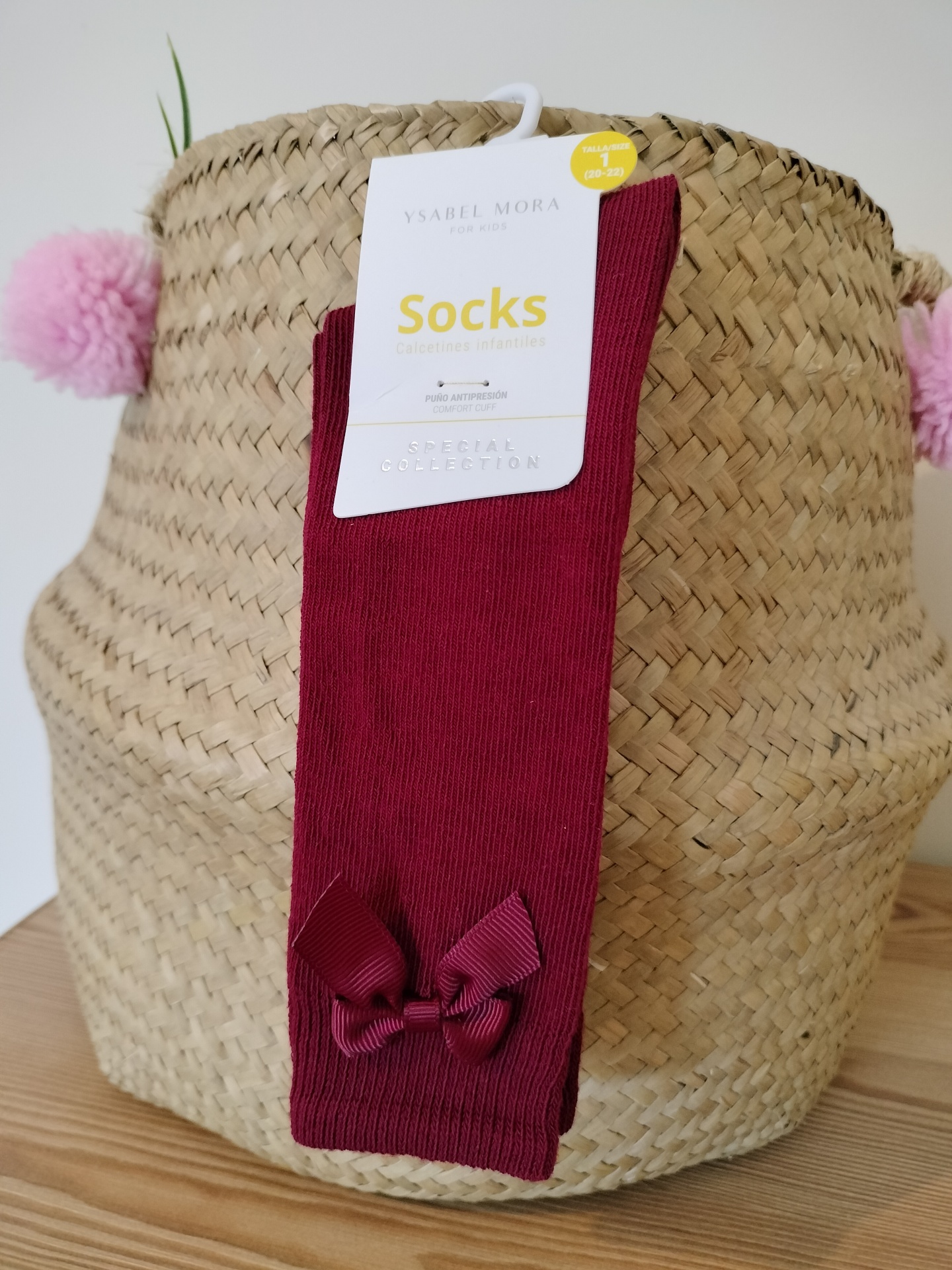 • Meias bordô com laço penduradas em saco de palha com pompons cor-de-rosa.
