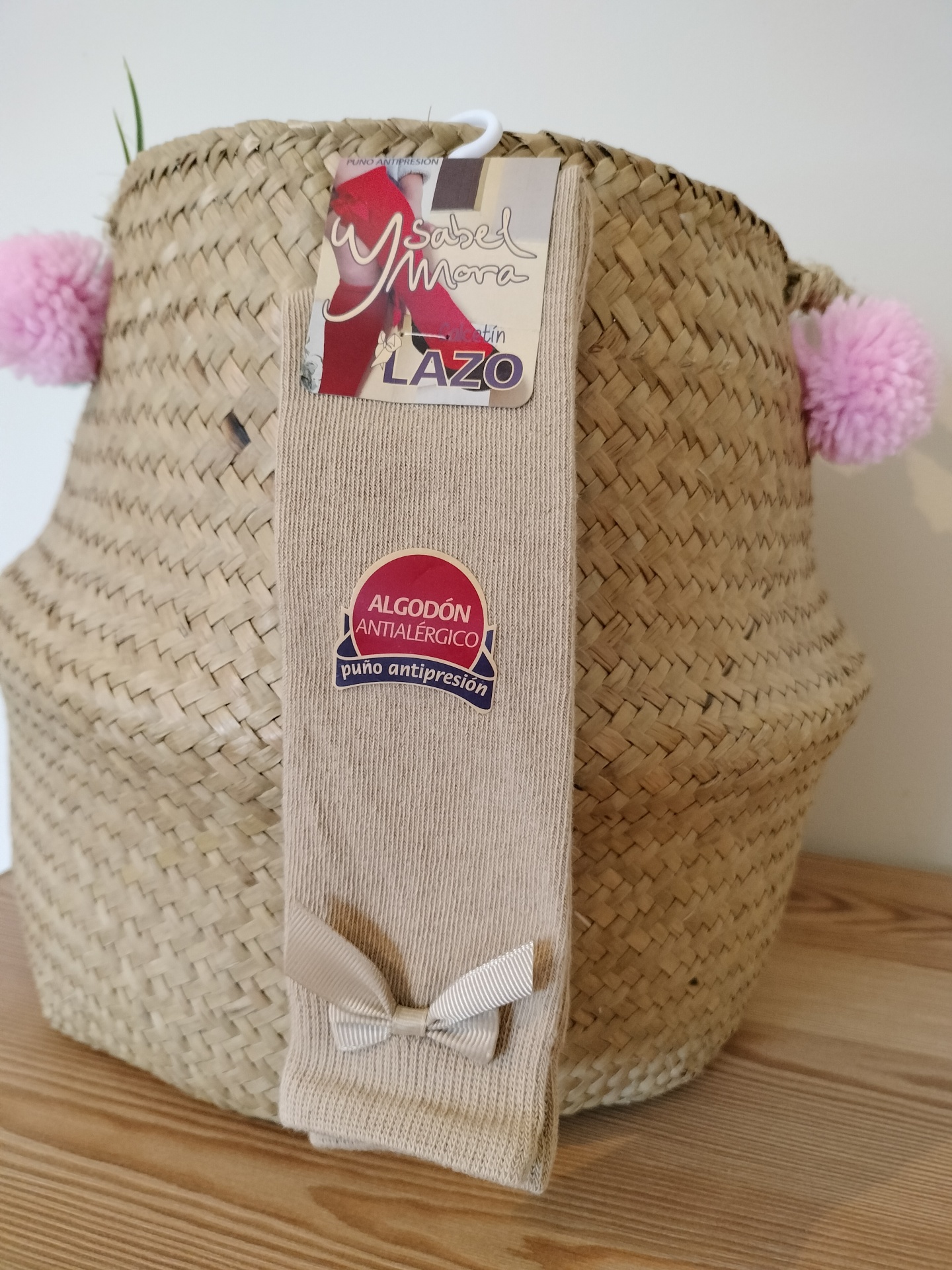 • Meias de algodão bege claro com laço e etiqueta penduradas em cesta de palha com pompons cor-de-rosa