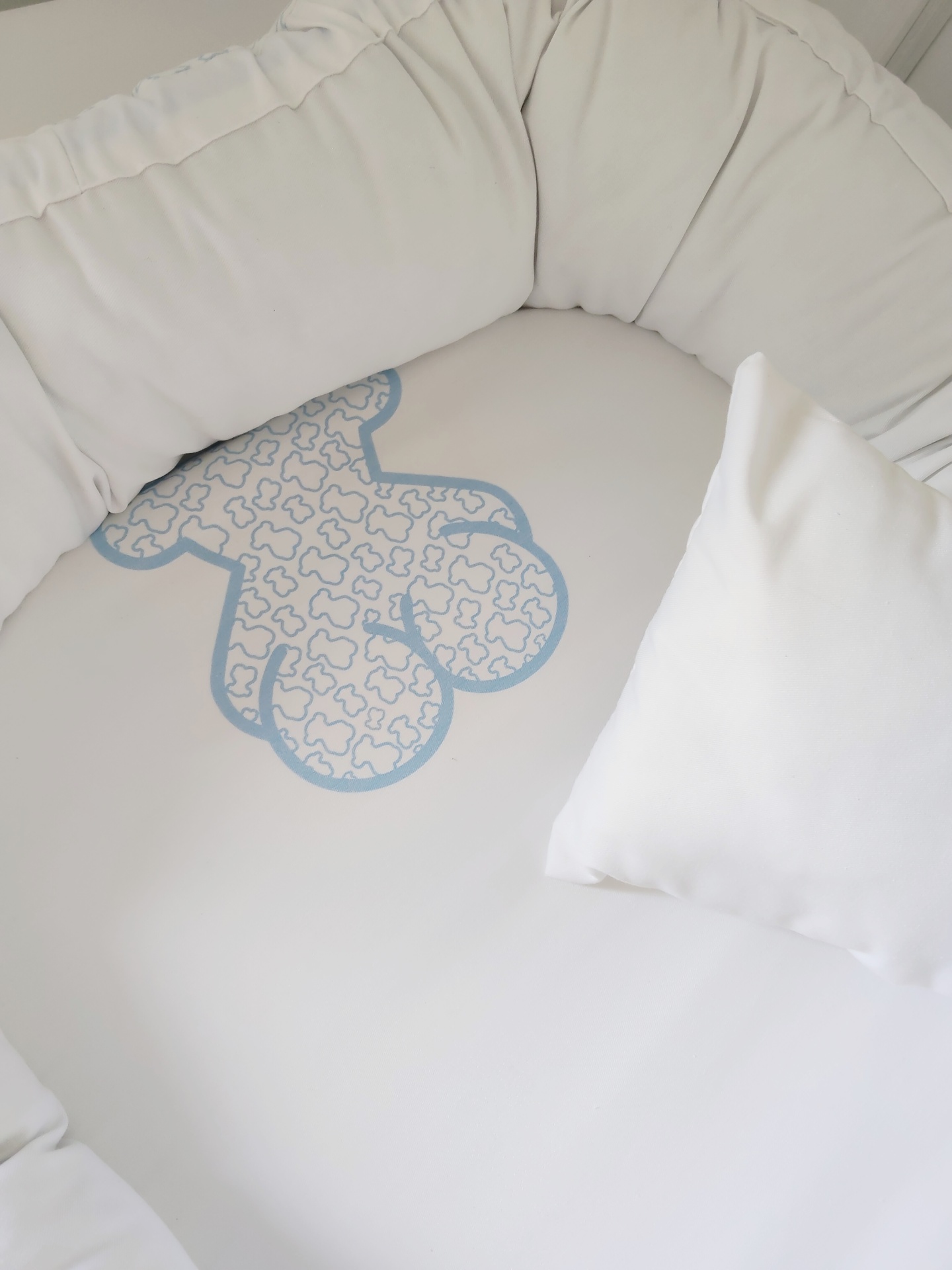 • Berço branco redondo com acolchoado macio e almofada branca, com desenho azul em forma de urso no colchão