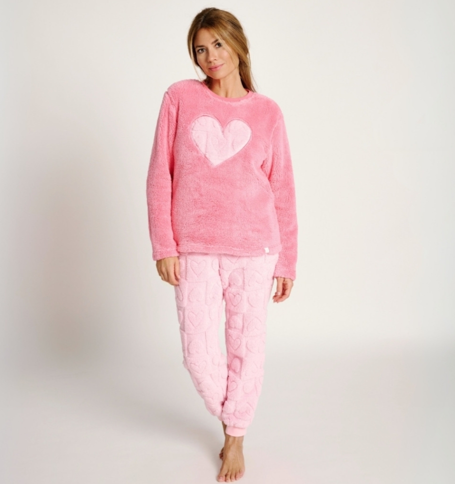 Pijama rosa felpudo com padrão de corações, modelo feminino em fundo branco