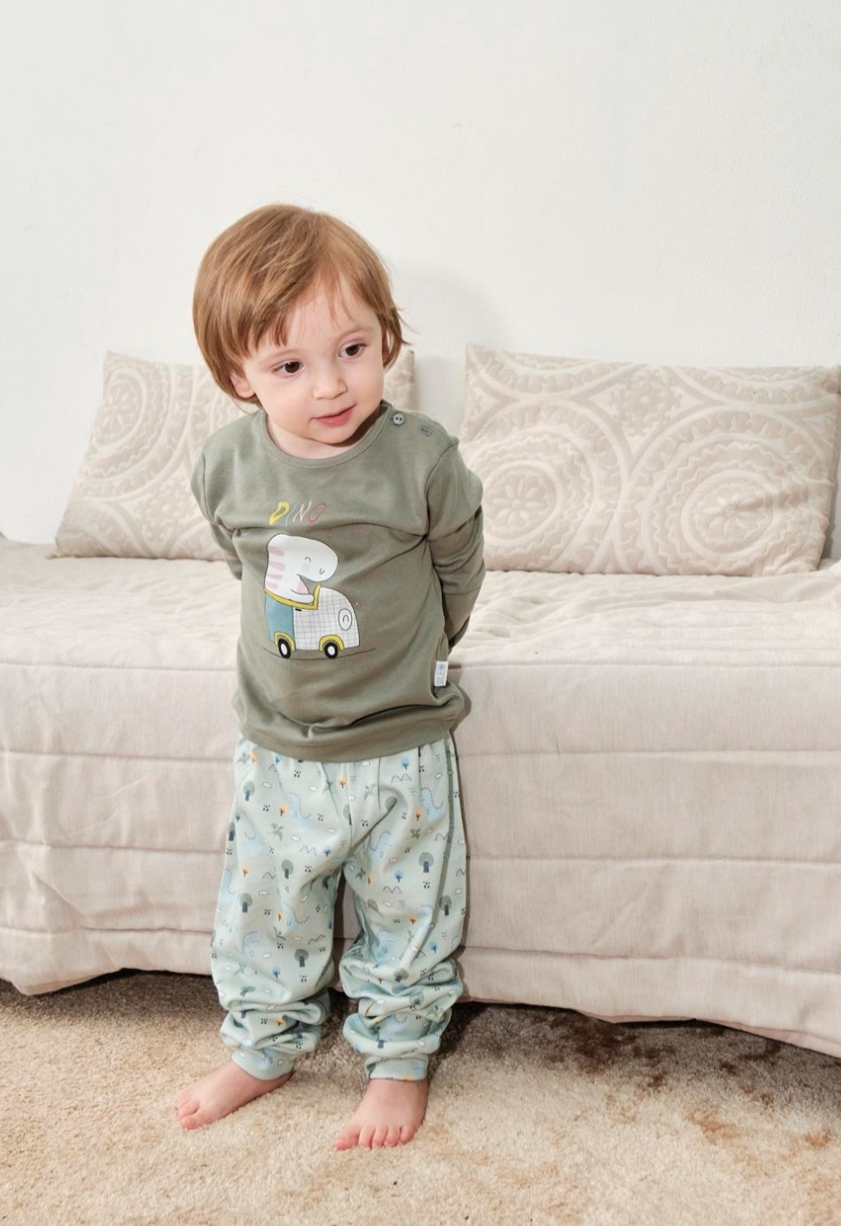 • Criança vestindo roupa verde e calças com padrão azul em frente a sofá bege.