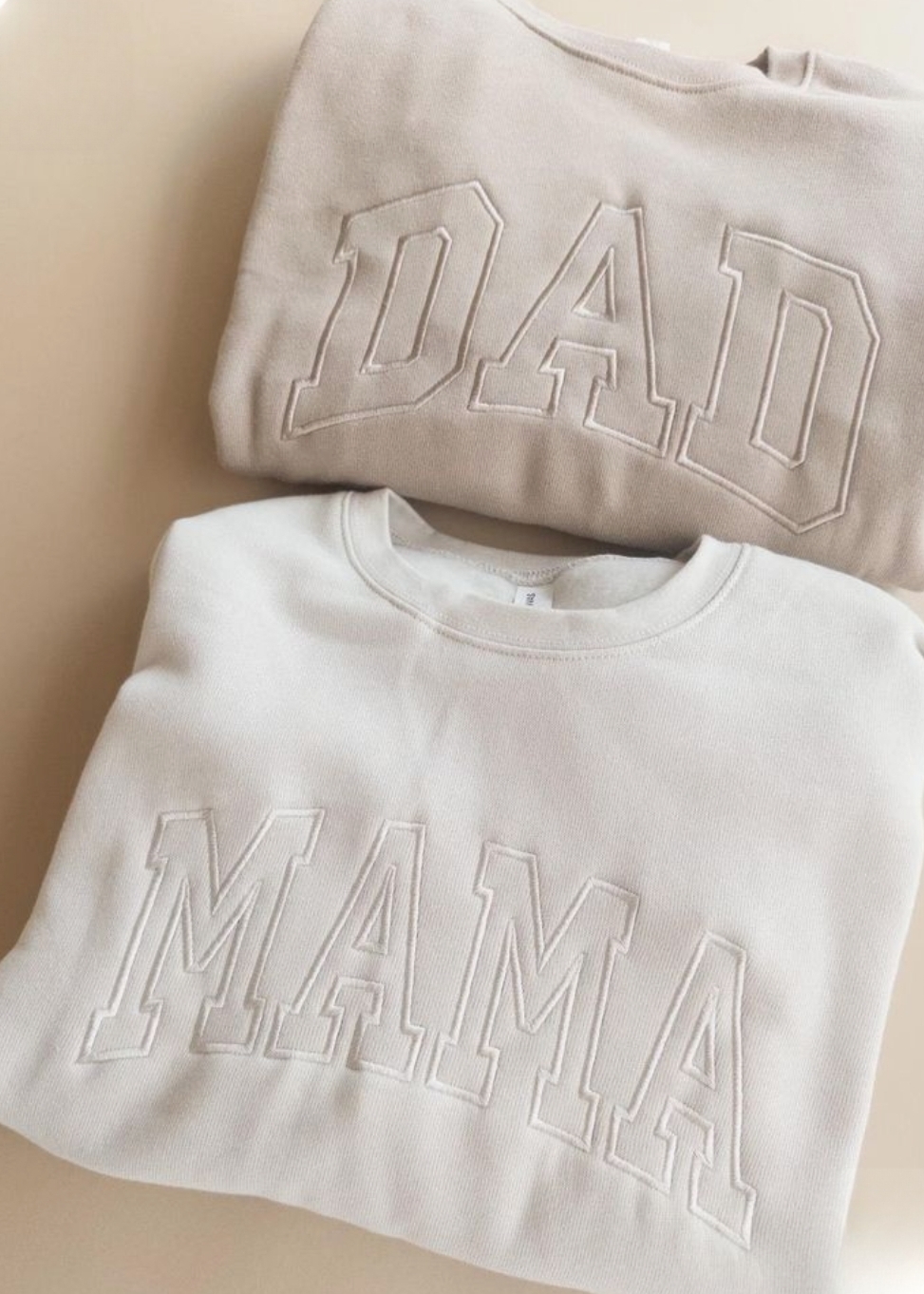 Duas sweatshirts dobradas com palavras DAD e MAMA bordadas