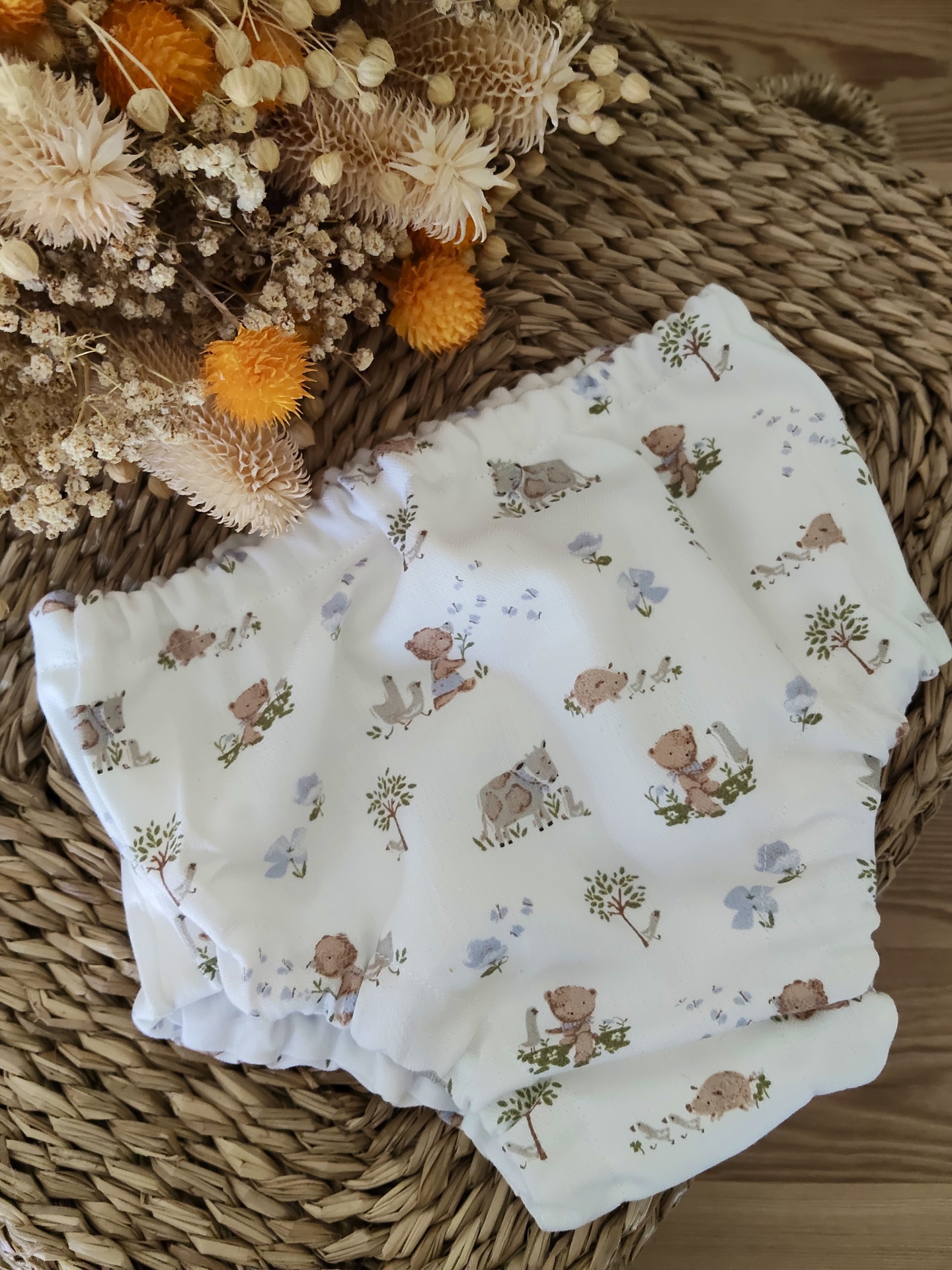 • Cuecas de bebé brancas com estampado de animais e flores, sobre base trançada castanha com flores secas ao lado