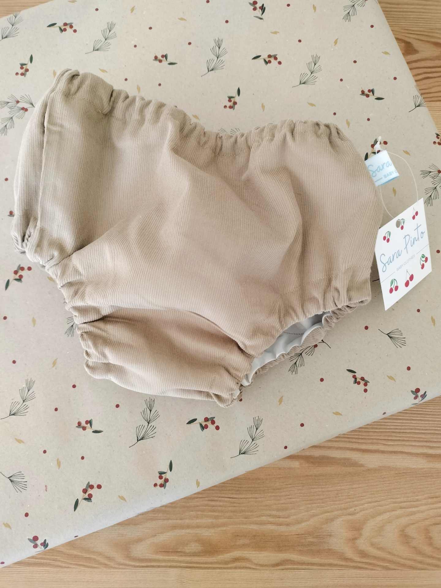 Cueca para bebé bege claro com elásticos sobre tecido estampado com folhas e frutos.