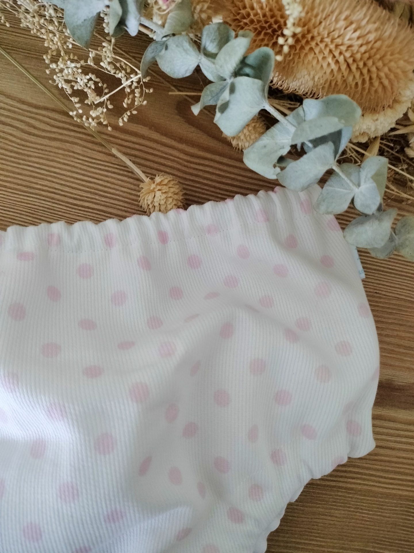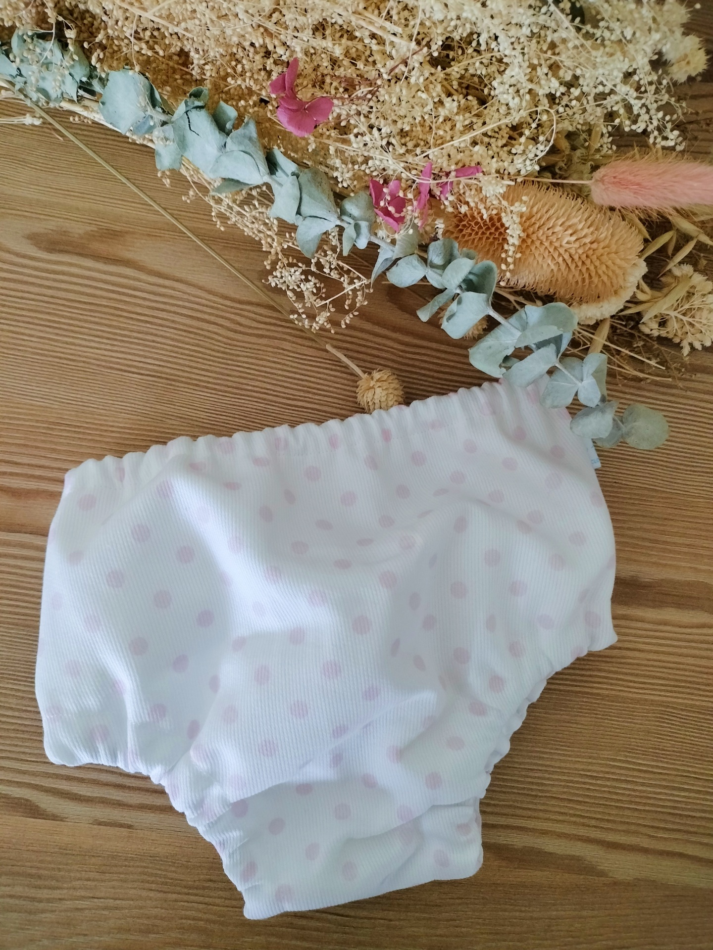 Fralda ou calção para bebé branco com padrão de bolinhas cor-de-rosa sobre madeira e flores secas