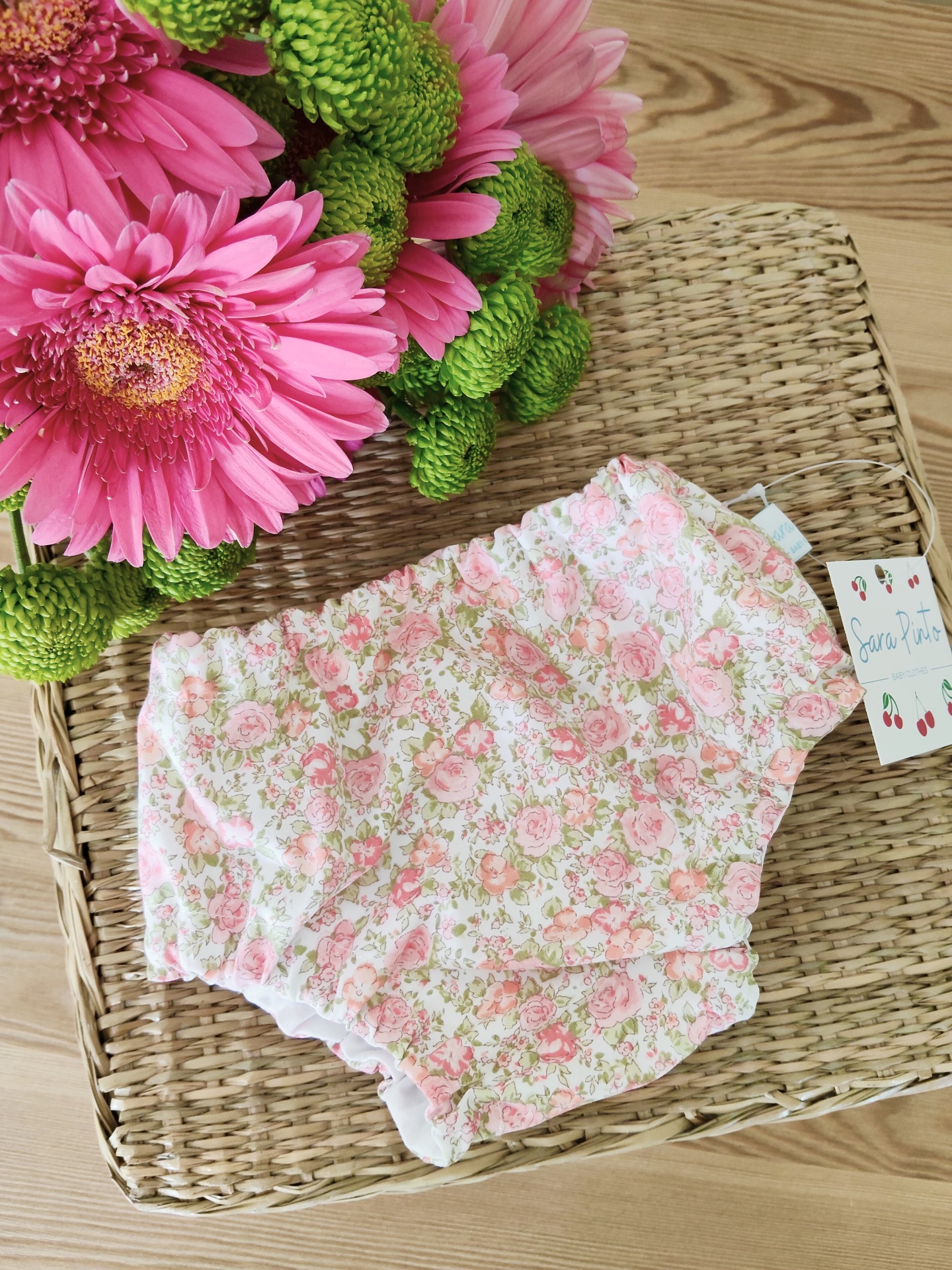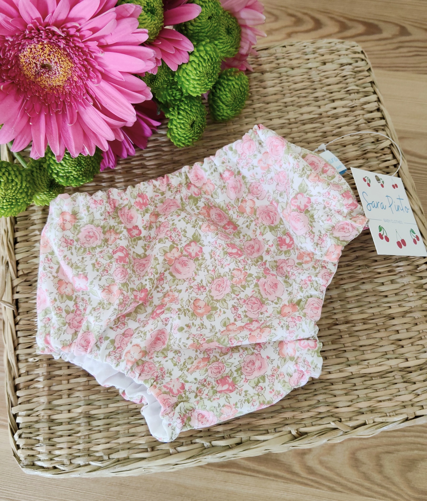 • Calções de bebê florais em tecido branco com elástico, base de cortiça e flores cor-de-rosa