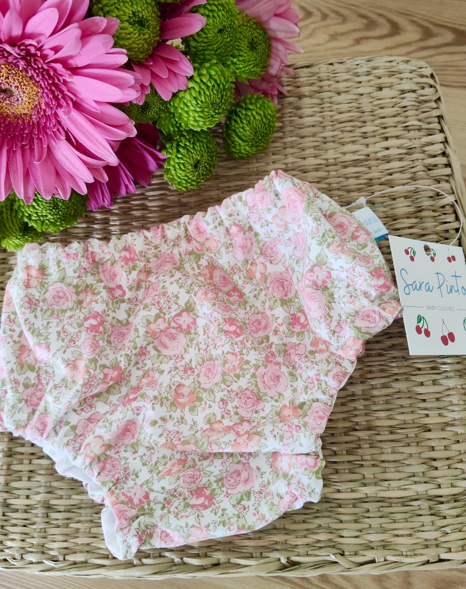 • Cuecas de bebé florais rosa e verde com etiqueta Sara Pinto sobre base de vime e flores